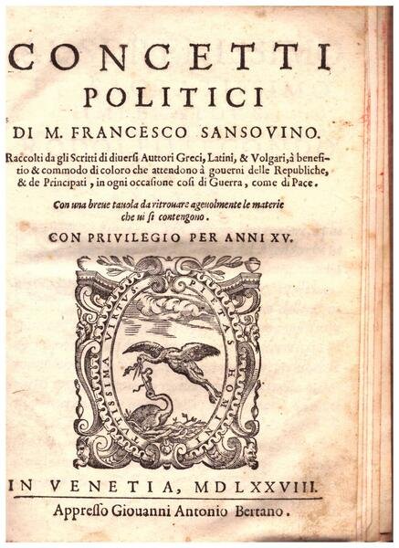 Concetti politici.raccolti da gli Scritti di diversi Auttori Greci, Latini & Volgari, à beneficifio & commodo di coloro che attendono à governi delle Repubbliche, & de Principati, in ogni occasione così di Guerra come di Pace.