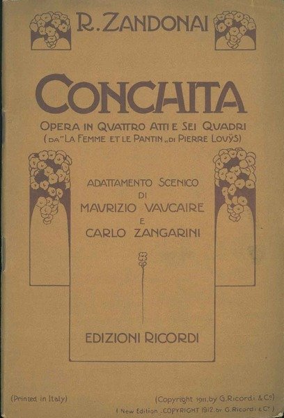 Conchita. Opera in quattro atti e sei quadri, da "La femme et le Pantin" di Pierre Louys. Adattamento scenico di Maurizio Vaucare e Carlo Zangarini. | Libros antiguos y modernos | Zandonai Riccardo