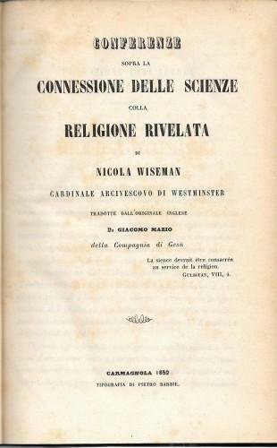 Conferenza sopra la connessione delle scienze colla Religione Rivelata di Nicola Wiseman Cardinale Arcivescovo di Westminster