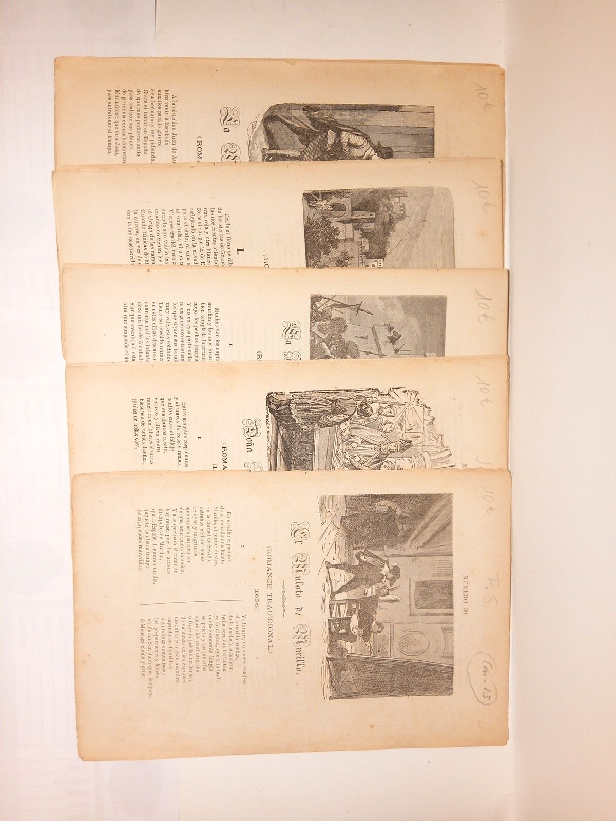 Madrid: Est. Tip. de Eduardo Cuesta o Imprenta de José Noguera, 1870-1873.- Conjunto de Romances Históricos de cuatro páginas cada uno: ilustración en la primera página y escudo en la cuarta; 4º (24,5 cm).; Cubiertas provisionales.- CONTIENE: La muerte de un artista [Alonso Cano]. El mejor premio del Arte [Velázquez]. El Ave - María (1491) [Granada]. Alvarez de Castro (1809 a 1810). Bailén (19 de julio de 1808). Pedro de Vera [Canarias, 1483 - 1488]. La prisión de Quevedo (1639). La Victoria de Lepanto. La Campana de Huesca (1136). El Príncipe Don Carlos (1568). Justicia del Rey Don Pedro (1357). La batalla de Otumba (1520). El Mulato de Murillo (1556). Una aventura de Olmedo (1620 a 1630). El soplo de la muerte (1539) [Emperatriz Isabel]. Doña Juana la Loca ( 1496 a 1555). Zaragoza (1808 a 1809). El Laurel de la Zubia (1491). El Suplicio de D. Alvaro de Luna (1453). La muerte de Escobedo (1578). La muerte de Escobedo (1578). Se editaban como pliegos sueltos para encuadernar. SE VENDEN SUELTOS, cada uno al precio indicado.* Para su mejor protección se les ha puesto unas cubiertas de papel. Buen estado en general, excepto el Romance del Príncipe Don Carlos que está algo sucio y el Romance de Pedro de Vera que está falto de la esquina inferior interna, sin afectar nada al texto. LITERATURA Y FILOSOFÍA ESPAÑOLAS DE LOS SIGLOS XIX-XXI Y SU HISTORIA EN GENERAL