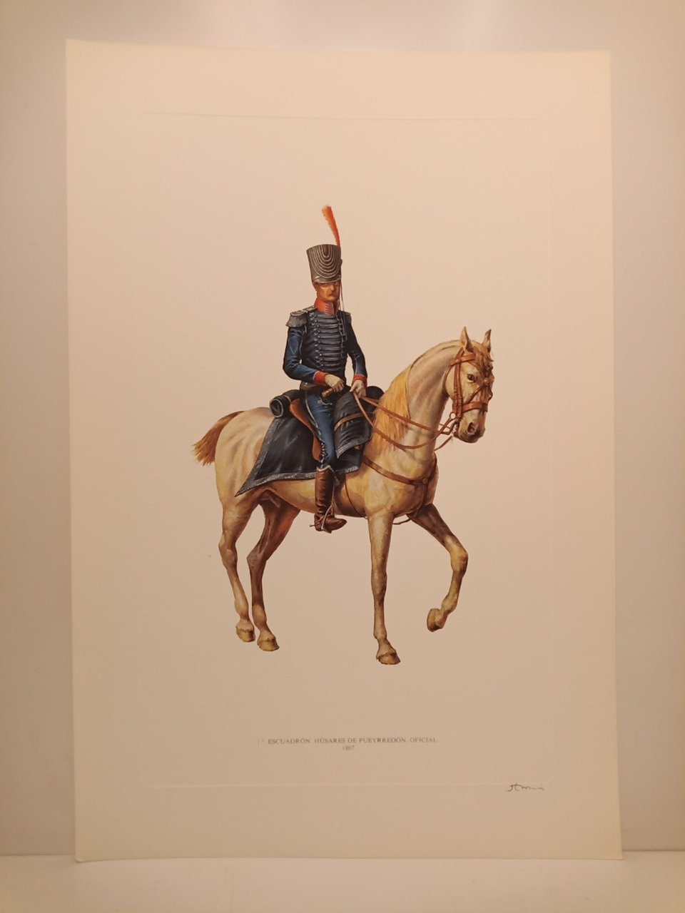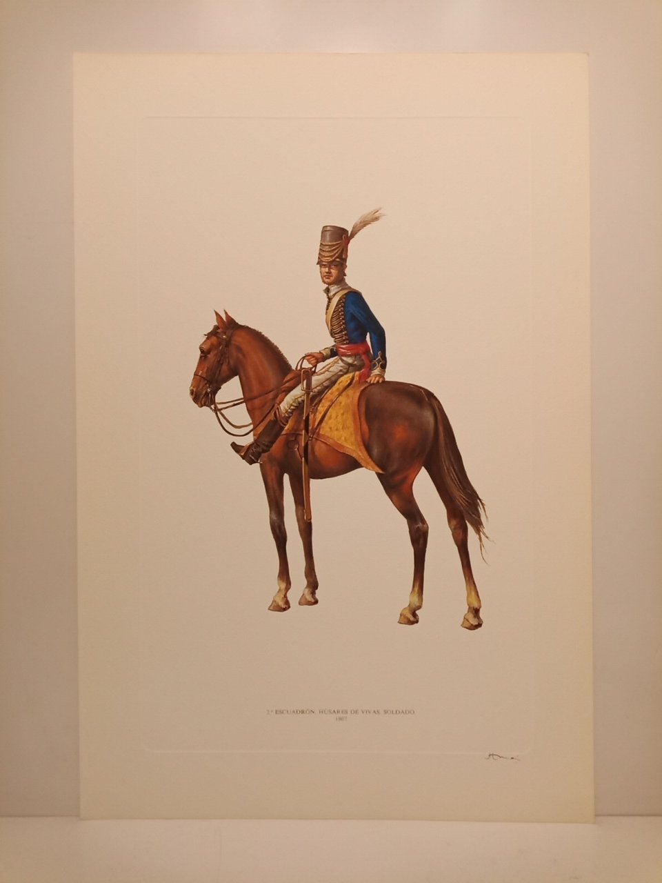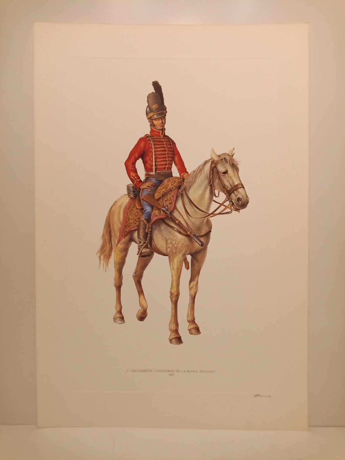 Madrid: ReproArt, [ca. 1978].- [6 h.] que son seis preciosas litografías a todo color mostrando a soldados de diversos Regimientos de Caballería, firmadas a mano por el artista + [2 h.], una a modo de presentación de la edición y otra del Servicio Histórico Militar con una relación del contenido; Gran Folio (50 x 34 cm); Finamente estampadas en papel Súper Alfa Guarro de 231 gramos; Carpeta en Cartulina Ed. con solapa, conteniendo los grabados sueltos.- Edición limitada de 1000 ejemplares. CONTIENE: [1] 1.er Escuadrón. Húsares de Pueyrredón. Oficial. 1807; [2] 2.º Escuadrón. Húsares de Vivas. Soldado. 1807; [3] 3.er Escuadrón. Húsares de Núñez (Infernales). Oficial. 1807; [4] 4.º Escuadrón. Cazadores de la Reina. Soldado. 1807; [5] Miquelete de Castex. Sldado. 1807; [6] Carabineros de Carlos IV. Soldado. 1807.* Esta es la carpeta número 1 sobre los Húsares, que se vende suelta. Se editó junto a otras dos dedicadas a la Artillería y la Marina. José Luis Román es un pintor español nacido en el año 1949, cuya obra gráfica como la que muestran estos grabados alcanzó una considerable notoriedad fuera de España y particularmente en Francia, donde muchos de sus trabajos se encuentran en el Musée de l'Armée. EJÉRCITO Y TEMAS MILITARES