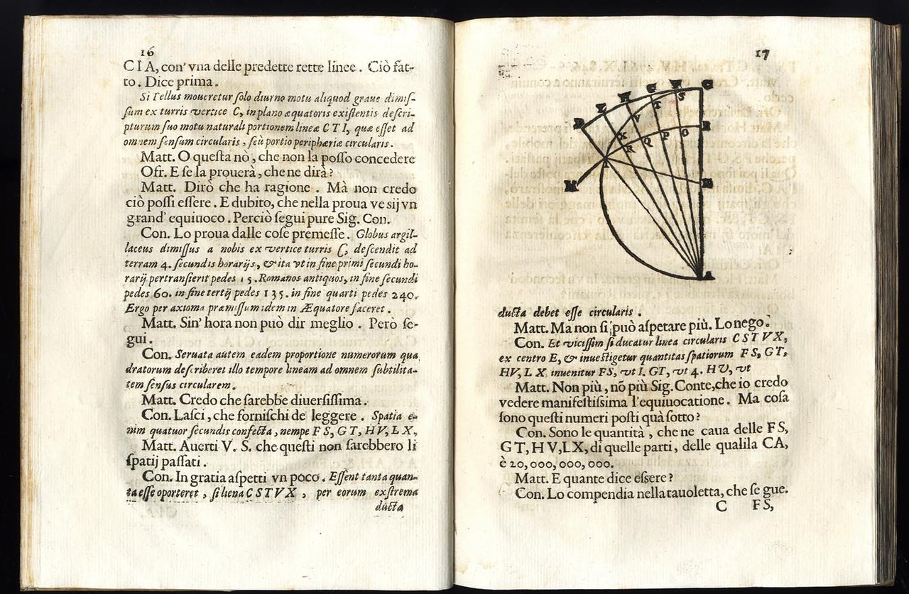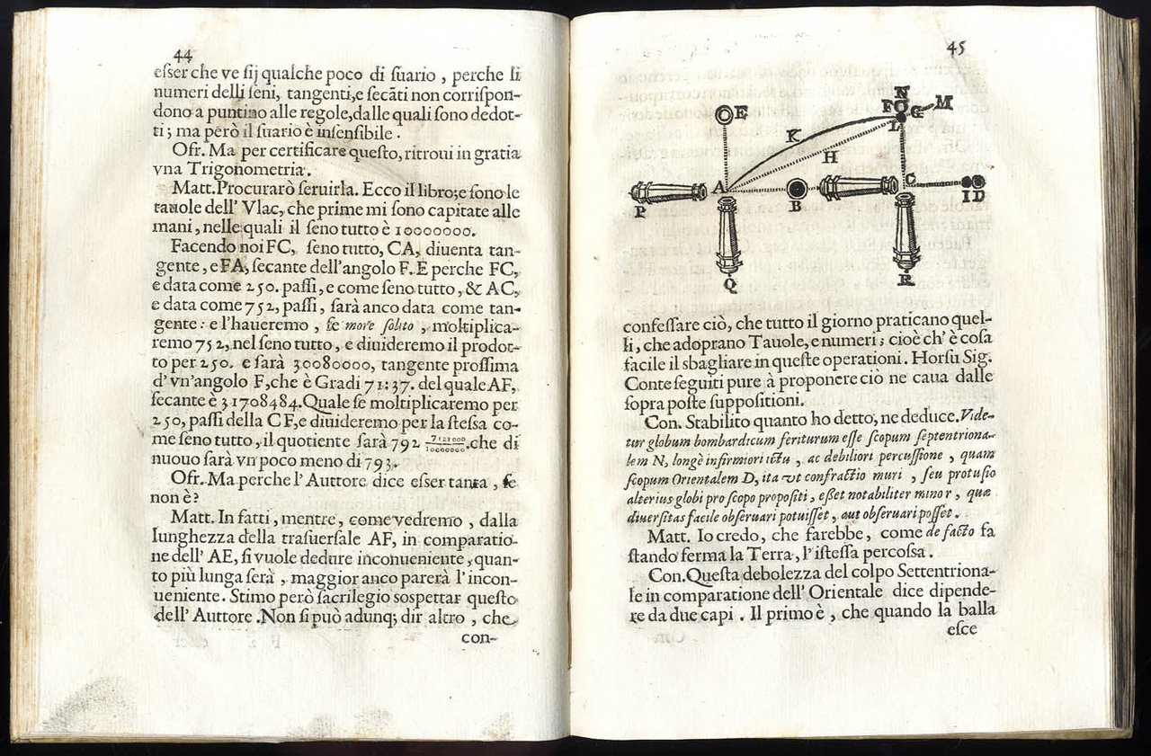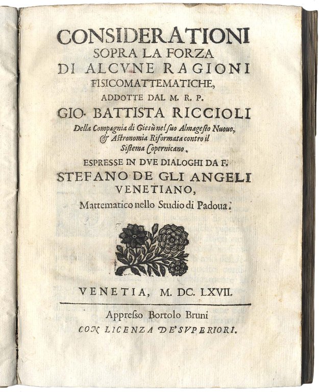 >in-4, leg. perg. ant., pp. (8), 134, (2 b.); iniziali, testatine e figure geometriche nel testo, tutto in xilografia. Legatura coeva in p. pergamena, titolo manoscritto (sbiadito) al dorso. Fa parte dei "pamphlet" in forma di dialogo in polemica con le teorie esposte dal Riccioli, prima nell'Almagestum novum (Bologna 1651). Padre Degli Angeli era anticopernicano e direttamente coinvolto nella mobilitazione culturale scientifica della Chiesa in difesa della tradizione derivante dalle Scritture e dai Padri. La sua critica si riferiva alle ragioni teoriche che Riccioli portava per dimostrare l'immobilità della terra. L'autore (Venezia 1623 - Padova 1697), gesuita e poi prete secolare, fu illustre geometra e matematico, confratello e collaboratore di Bonav. Cavalieri a Bologna e dal 1662 sino alla morte insegnante sulla cattedra di matematica dello Studio di Padova che era stata di G. Galilei, di cui fu tra i primi a seguirne le teorie. Esemplare fresco e genuino (piccola menda alla carta P3). Cinti 301. RICCARDI I (I), 35-36 ''Di molto pregio scientifico... è raro rinvenire uniti questi quattro libri...''. WALESON, Crerar Library, University of Chicago Lib., p. 6.
