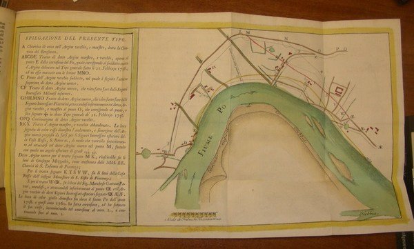 in-4 antico, pp. 26, leg. mod. carta dec. Con una gr. tav. in rame ripiegata al fine (mm. 270x510) con bella coloritura coeva raff. il corso del Po nella zona studiata. Riccardi I, p. 216.12. Belliss. esempl. [MM5-352]