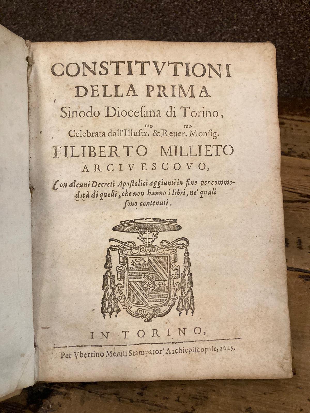 In-4° antico (21x15 cm), pp. (4) 135 (1), legatura in piena pergamena rigida coeva muta con fregi impressi a secco al dorso, piatti riquadrati con fregio al centro il tutto dorato, nervetti passanti alle cuffie. Frontespizio con titoli e stemma del Millieto, capolèttere animati silografici. Alcune pagine lievemente brunite o arrossate, ma più che buon esemplare genuino. Pregevole edizione originale elegantemente stampata di quest'opera importante testimonianza del primo sinodo dicoesana taurinense. Indice alfabetico delle materie oggetoo della sinodo.