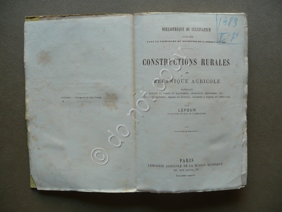 Lefour, Bibliothèque du cultivateur - Constructions rurales et mécanique agricole materiaux, travaux et tarifs de maçonnerie, charpente, menuiserie, etc. forges et moteurs, machines a vapeur et vehicules par Lefour Inspecteur Géneral de l'Agricolture deuxième edition Librairie Agricole de la Maison Rustique, Paris, s.d. (1860-70 circa), cm 18,5x12, pp. 216 con varie belle ill. incise in b/n nel testo e a p.p., brossura ed. ill. in b/n. Testo in francese. Dorso con vecchia etichetta applicata. Contropiatto ant. con applicato ex libris del precedente proprietario. Angolo sup. del frontespizio con una nota numerica a matita blu. Condizioni di conservazione Esemplare in buono stato con tracce d'uso e del tempo, brossure con alcuni piccoli difetti ai margini e agli angoli, angolo inf. della br. post. con una piccola mancanza (vedi foto), dorso con segni d'utilizzo e qualche piccolo strappetto, cerniera ant. con una fessurazione di qualche cm alla parte inf., esemplare compatto. Interni buoni con piccole lievi bruniture. Varie belle illustrazioni incise in bianco e nero nel testo e a piena pagina. Testo in francese. SETT81.L7169 N