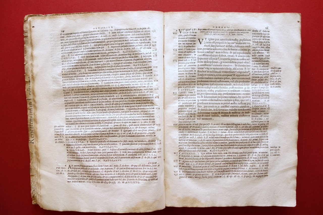Cinquecentina, † Consuetudines Neapolitanae cum glosa napodani nunc primum authore Camillo Salerno Aditionibus ill. Iureconsultorum quos versa pagina indicabit, nec non et suis auctae [.] Apud Ioannem de Boy, Neapoli 1567; cm 30,5x21,5; pp. [19]-396-[4], con alcuni bei capilettera e qualche fregio xilografici; ultima pagina non num. e frontespizio con bello stemma xilografico. Legatura d'epoca in tutto cartonato di risulta con titolo annotato a mano al dorso, piatti rivestiti con pagine di antica opera a stampa, il dorso con pagina di manoscritto il cui testo Ë visibile ai contropiatti (vedi foto). Alla prima carta bianca ex libris applicato e qualche rimovibile nota bibliografica a matita del precedente proprietario. Al frontespizio antico ex libris redatto a mano. † Condizioni di conservazione Esemplare complessivamente in buono stato con tracce d'uso e del tempo; coperta con alcune irregolarit‡, macchie e ombre di gore che non interessano le pagine; piccole / circoscritte mancanze e qualche rado danno da insetto, questi ultimi che interessano in misura piccola e marginale qualcuna delle prime e ultime pagine ma non il testo. Interni buoni con piccole leggere bruniture, ai margini di alcune pagine lievi ombre di gore che non interessano il testo. Qualche errore tipografico di numerazione, ma esemplare completo e legato correttamente. † Prima edizione, molto rara. † SETT218.L20578 N