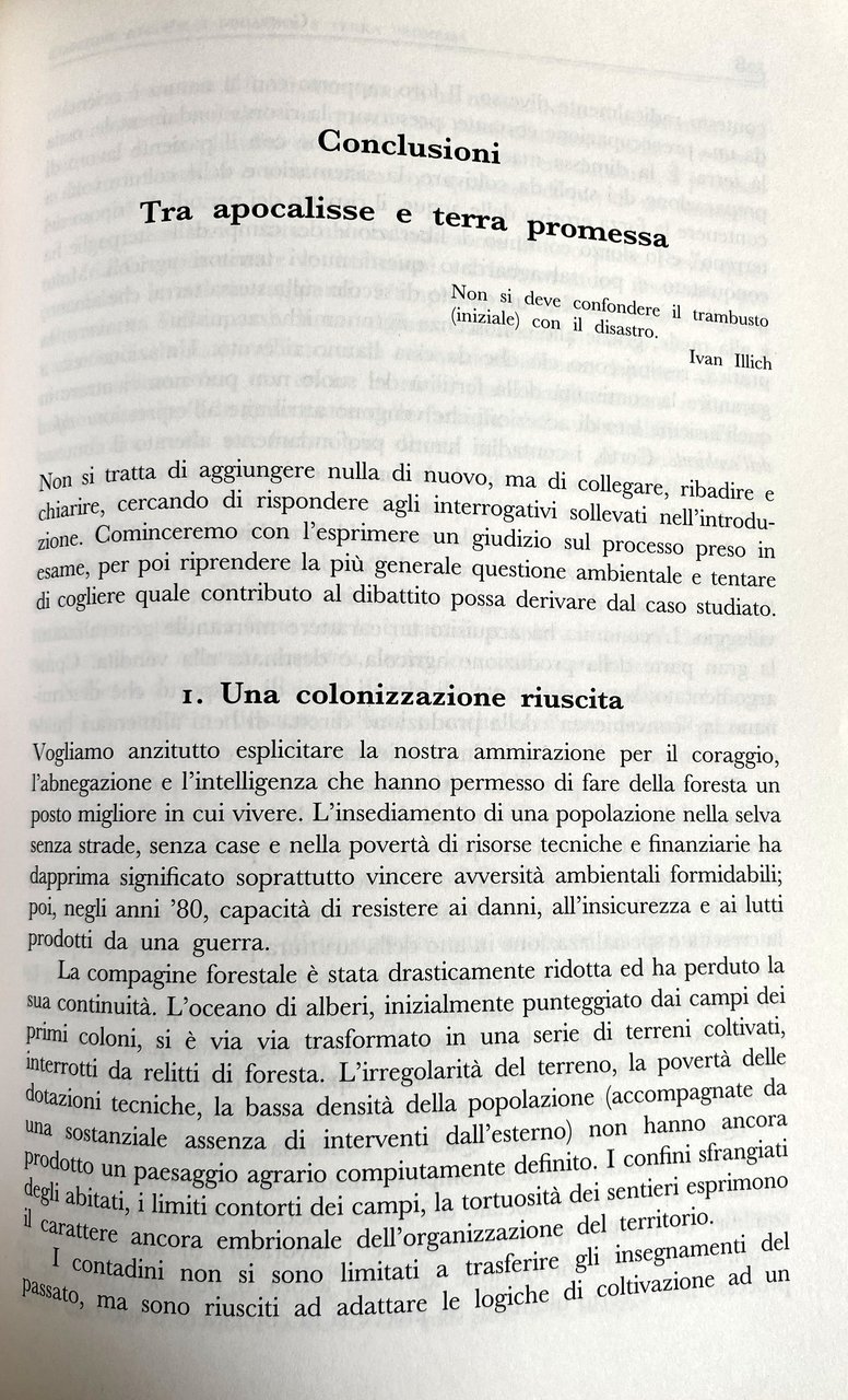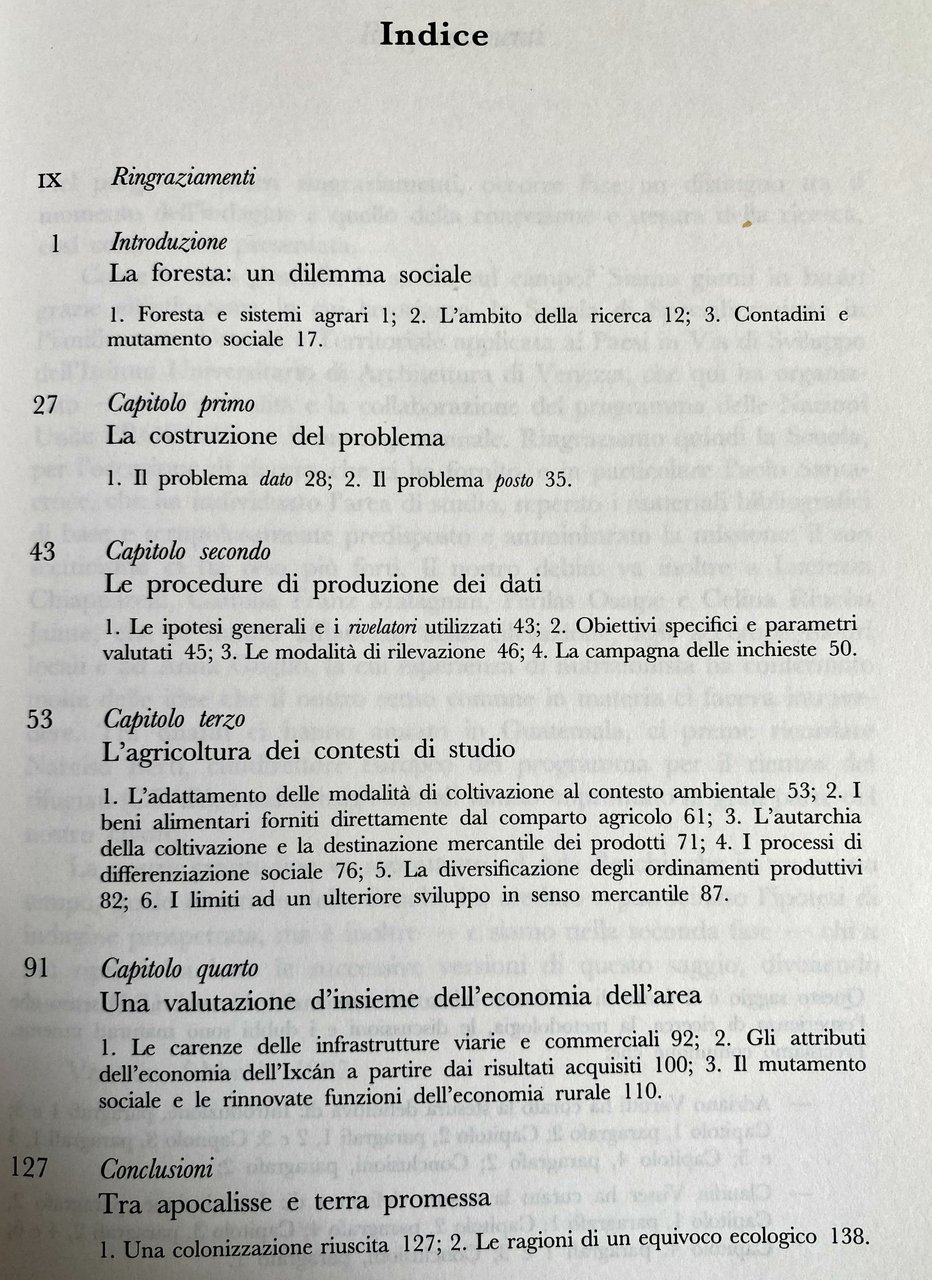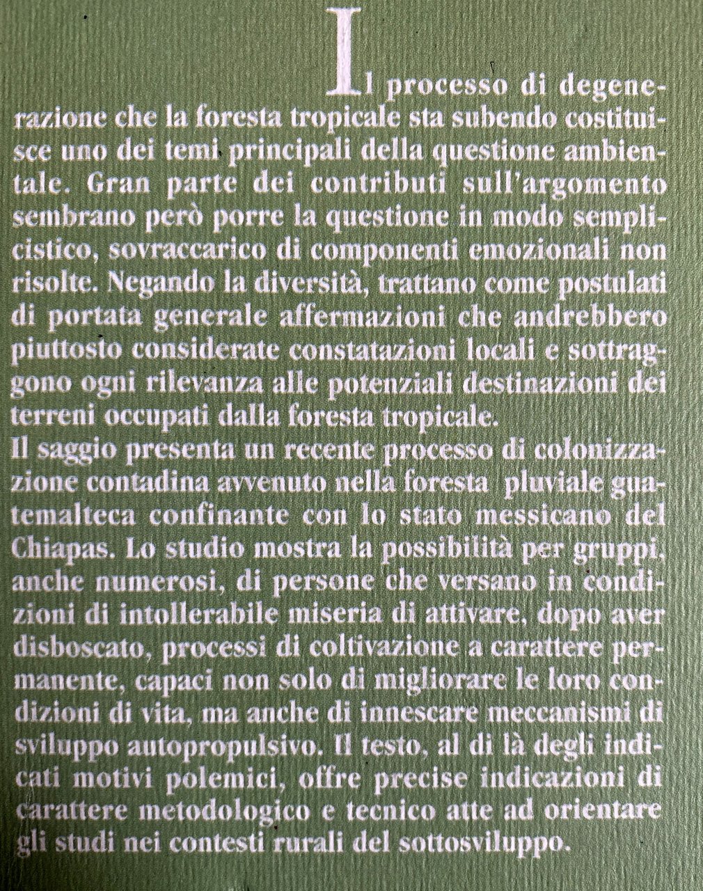 Il processo di degenerazione che la foresta tropicale sta subendo costituisce uno dei temi principali della questione ambientale. Gran parte dei contributi sull'argomento sembrano però porre la questione in modo semplicistico, sovraccarico di componenti emozionali non risolte. Negando la diversità, trattano come postulati di portata generale affermazioni che andrebbero piuttosto considerate constatazioni locali e sottraggono ogni rilevanza alle potenziali destinazioni dei terreni occupati dalla foresta tropicale. Il saggio presenta un recente processo di colonizzazione contadina avvenuto nella foresta pluviale guatemalteca confinante con lo stato messicano del Chiapas. Lo studio mostra la possibilità per gruppi, anche numerosi, di persone che versano in condizioni di intollerabile miseria di attivare, dopo aver disboscato, processi di coltivazione a carattere permanente, capaci non solo di migliorare le loro condizioni di vita, ma anche di innescare meccanismi di sviluppo autopropulsivo. Il testo, al di là degli indicati motivi polemici, offre precise indicazioni di carattere metodologico e tecnico atte ad orientare gli studi nei contesti rurali del sottosviluppo.