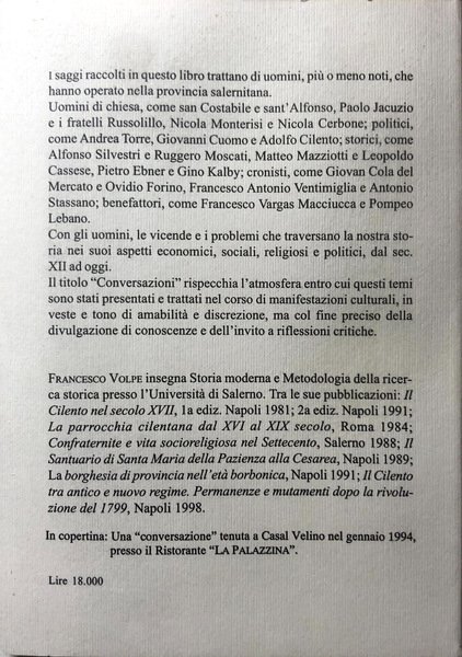 I saggi raccolti in questo libro trattano di uomini, più o meno noti, che hanno operato nella provincia salernitana. Con gli uomini, le vicende e i problemi che traversano la nostra storia nei suoi aspetti economici, sociali, religiosi e politici, dal sec. XII ad oggi. Il titolo "Conversazioni" rispecchia l'atmosfera entro cui questi temi sono stati