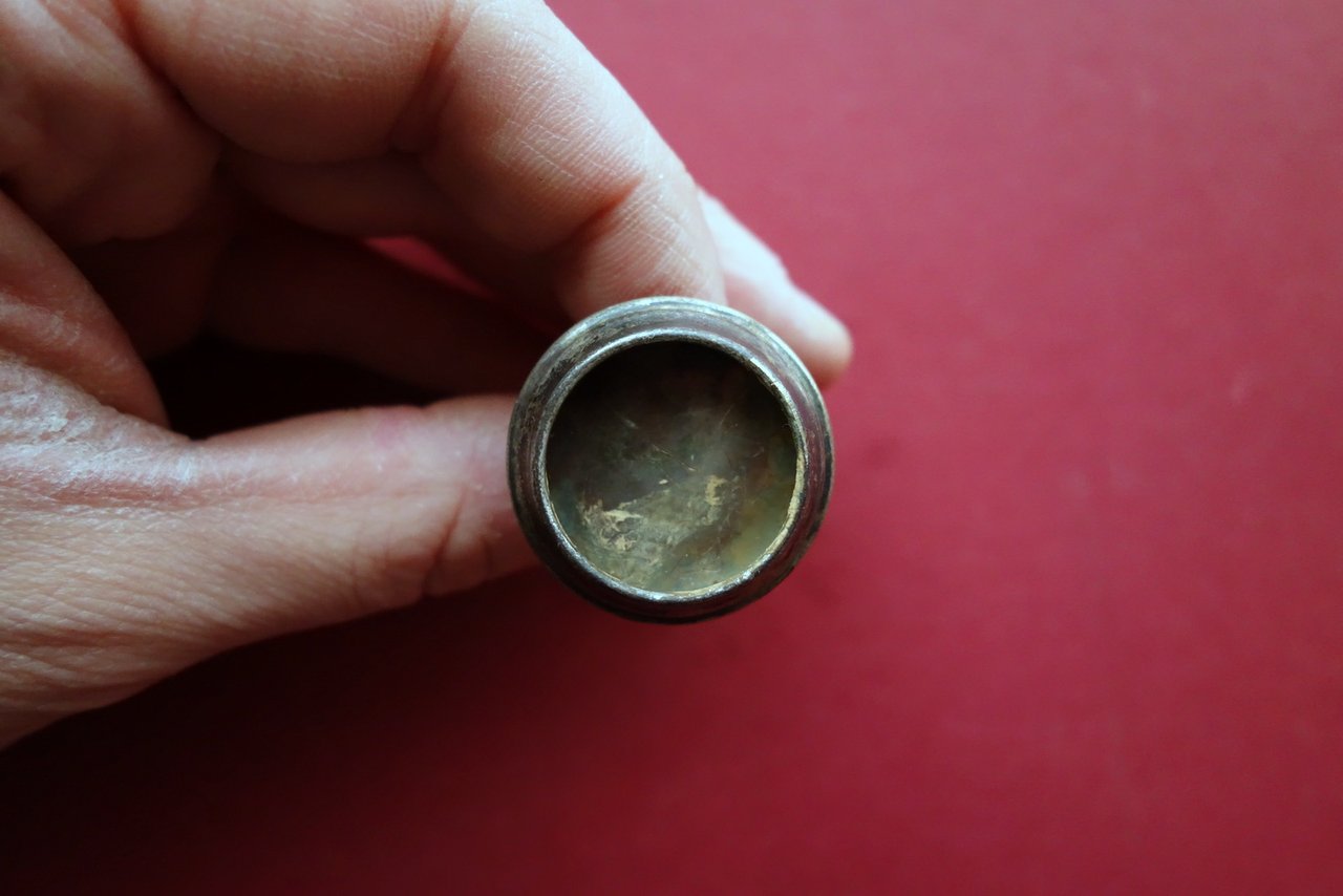 Copritappo in metallo (argento), Copritappo in metallo (argento?) scultura di amorino - cupido anni '40 circa Anni '40 del Novecento circa; bel copritappo in metallo (probabilmente argento), scultura di amorino - cupido. Originale d'epoca. Dimensioni: altezza cm circa 6; diametro cm 3. Condizioni di conservazione Buone condizioni con segni del tempo, scurimento del metallo e conseguente patina d'epoca. Per ulteriori dettagli vedi foto. Bello. Originale d'epoca. SC04.D0541 N