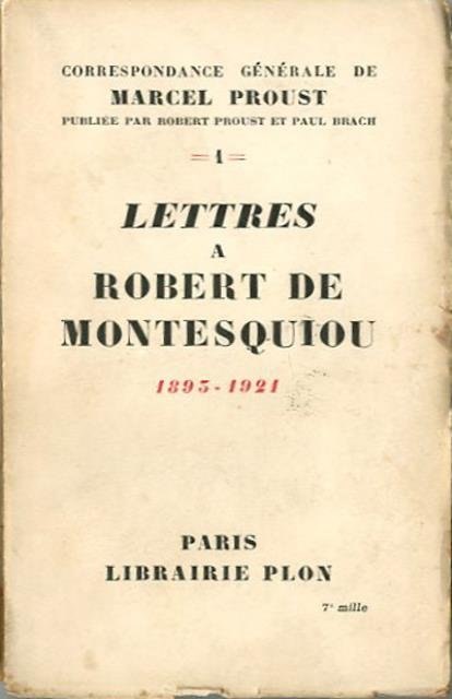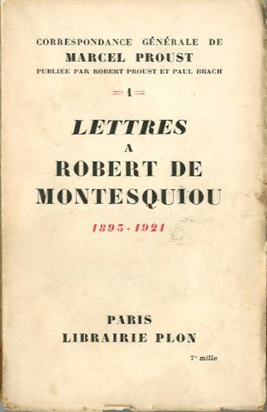 6 vol. in-8 ; 22 x 14 cm. Comprend les lettres à Robert de Montesquiou 1893-1921 (Tome 1); la Comtesse de Noailles 1901-1919 (Tome 2); M. et Mme Sydney Schiff, Paul Souday, J.-E. Blanche, Camille Vettard, J. Boulenger, Louis-Martin Chauffier, E. R. Curtius et L. Gautier Vignal (Tome 3); Paul Lavallée, J.-L. Vaudoyer, R. de Flers, Marquise de Flers, G. de Caillavet, Mme G. de Caillavet, B. Salignac-Fénelon, Melle Simone de Caillavet, R. Boylesve. E. Bourges, Henri Duvernois, Mme T.-J Gueritte et Robert Dreyfus (Tome 4); Walter Berry, Comte et Comtesse de Mangny, Comte V. d'Oncien de la Batie, M. Pierre de Chevilly, Sir Philip Sassoon, Princesse Bibesco, Mlle Louisa de Mornand, Mme Laure Hayman et Mme Scheikevitch (Tome 5); et Madame et Monsieur Emile Straus (Tome 6). Publiée par Robert Proust et Paul Brach. Coll. La Palatine, 1930 à 1936. Proust n'ayant jamais tenu de journal, ses lettres constituent le document le plus important qui subsiste sur sa vie et sa carrière d'écrivain. Elles permettent de suivre le développement de son oeuvre littéraire et d'en repérer les sources d'inspiration dans la réalité. Par la diversité et le nombre de ses destinataires, la correspondance de Proust est aussi une merveilleuse source documentaire sur la société parisienne et la culture française au tournant du siècle. Entre autres sujets d'actualité, on y trouve évoqués l'affaire Dreyfus, le procès d'Oscar Wilde, la séparation de l'Eglise et de l'Etat, la première guerre mondiale, Wagner, les Ballets russes, le mouvement Dada, la théorie de la relativité. Brossura editoriale, coperta in cartoncino flessibile con impresso il titolo al piatto e al dorso. Qualche lieve segno del tempo ai dorsi e alla pagine interne (ingiallimento), per il resto libri in buono stato, spesso con pagine intonse. Firma di appartenenza con data nell'anteporta. Codice libreria 4616.