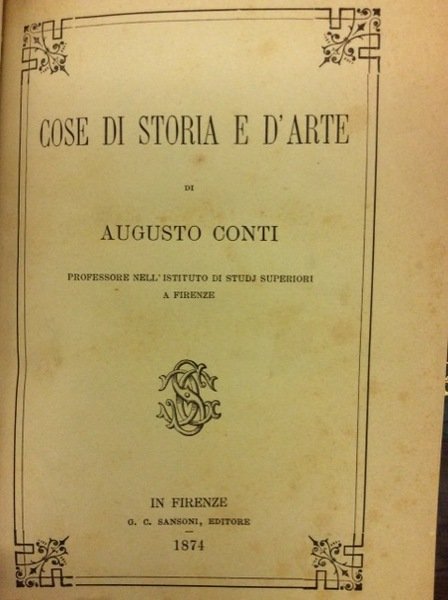 In-16 gr. (mm. 192x125), mz. pergamena coeva con ang., fregi e titolo oro al dorso, conserv. cop. orig., pp. VIII,492,(2). "Della vita e degli scritti di Giuseppina Turrisi Colonna - Il Protagora di Platone - La filosofia di Dante - Giovanni Dupré o Dell'Arte - Centenario del Petrarca in Provenza (1874), etc.". "Prima edizione" di questa raccolta del letterato e filosofo fiorentino (1822-1905). Cfr. CLIO,II, p. 1279. Ben conservato.