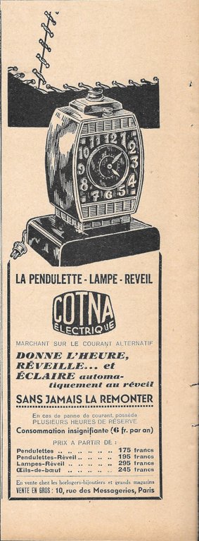 Cotna Electrique, la penduette, lampe, reveil - Advertising 1931