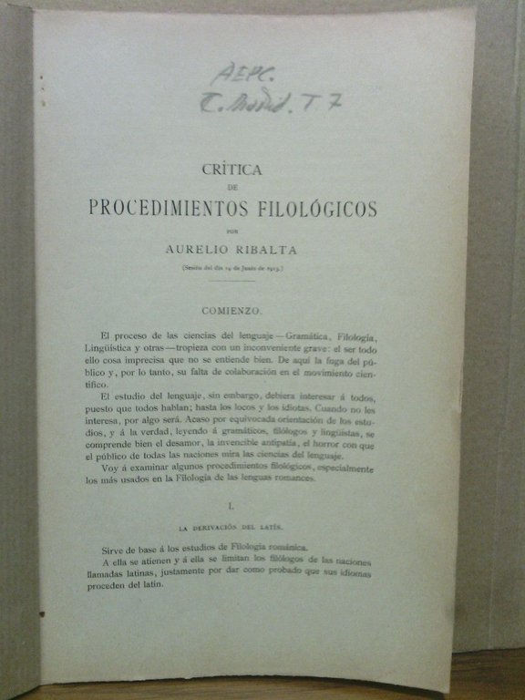 [Madrid]: Asoc. Española para el Progreso de las Ciencias, [1913].- P. 102-112 (en total 11 pags.); 4º (25 x 16,5 cm.); Cubiertas provisionales.- Desglosado del Boletin de la "Asociación Española para el Progreso de las Ciencias".Congreso de Madrid. Sesión del 19 de Junio de 1913. Sección 6ª. Ciencias Filosóficas, Históricas y Filológicas. Tomo VII.* Al tratarse de un desglose carece de cubiertas y se le han puesto unas provisionales en papel. LENGUA ESPAÑOLA