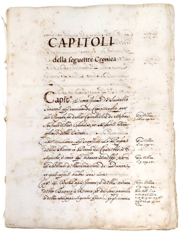 >in-folio (mm 275x210), ff. 169 manoscritti su entrambe le facciate in chiara grafia, 3 ff. bianchi, privo di legatura. Una bella iniziale con decorazione floreale in inchiostro. Interessante cronaca degli avvenimenti romani assemblata da anonimo compilatore raccogliendo e disponendo secondo nuovo ordine le notizie contenute nella ''Storia Universale'' di Giovanni e Matteo Villani, la cui prima edizione a stampa apparve a Venezia nel 1537. Il compilatore divise il suo lavoro in 28 capitoli, secondo l'indice ma ne vennero composti solo 26, che abbracciano l'arco cronologico 1327-1358. Buon esemplare con tracce di offset dovute all'acidità dell'inchiostro e qualche fioritura su alcune carte.