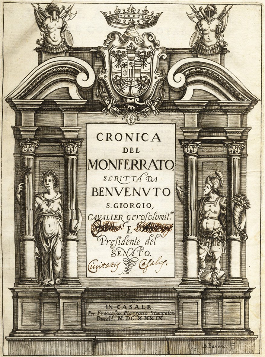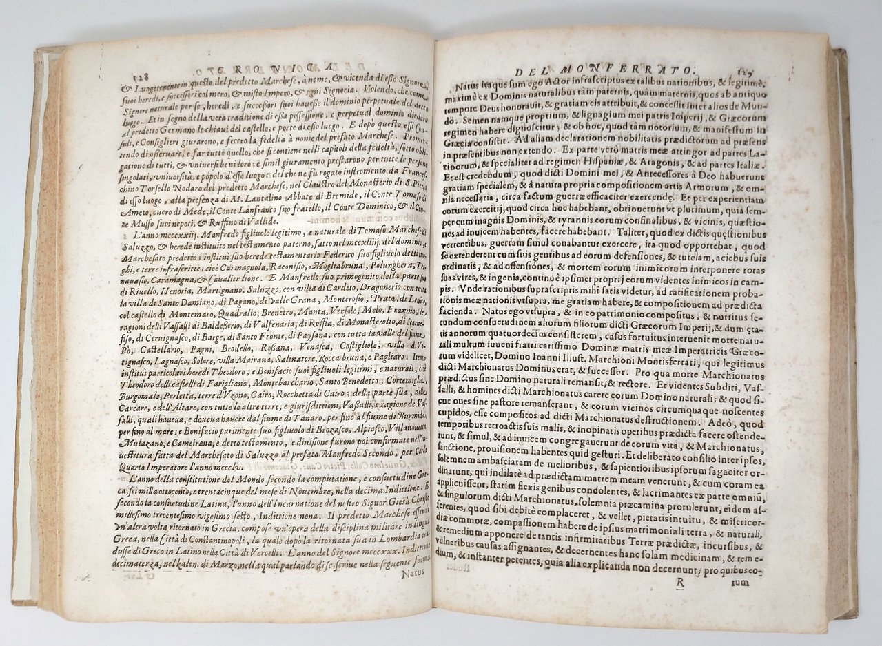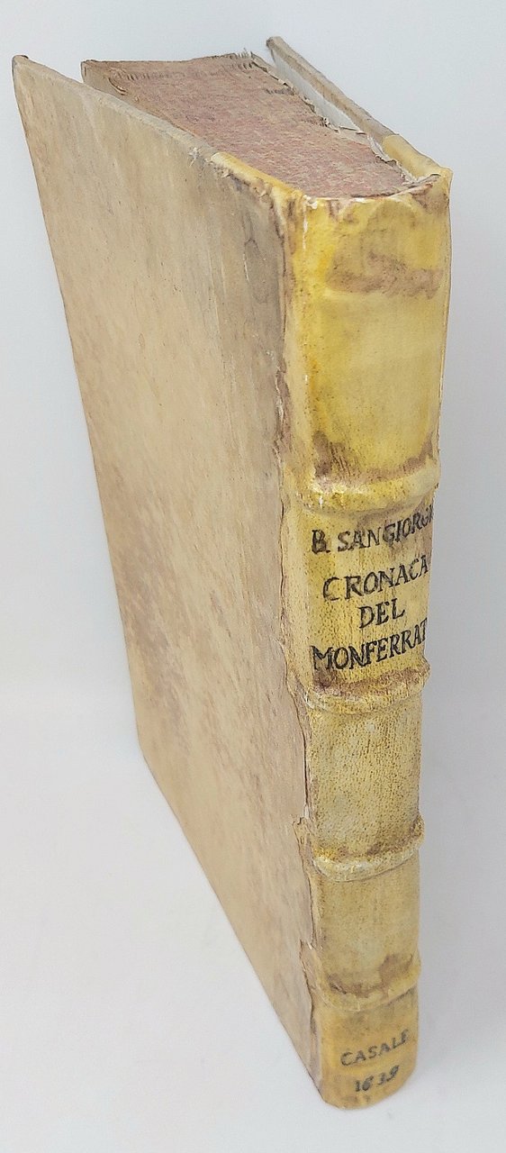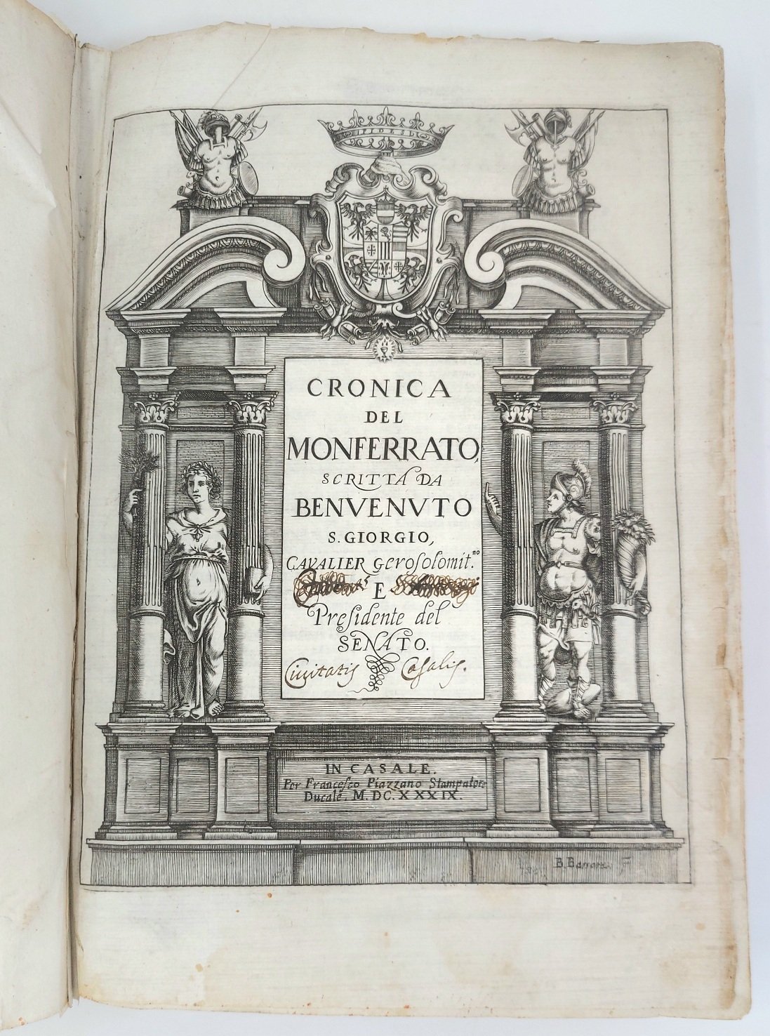 >in-folio, ff. (16), pp. (418), (2, con registro e colophon sul recto), leg. del tempo p. pergamena rigida, dorso a nervi anticamente rifatto con titolo manoscritto. Frontesp. figurato a motivo architettonico e con stemma araldico dei Marchesi di Monferrato, inc. in rame da B. Bassano; alcune iniz. e fregi silogr. Le prime 16 pagine contengono l'ampio indice ''tavola dei nomi e delle cose più notabili''. Rarissima edizione (la prima, con testo in latino, era già apparsa nel 1519) di questa fondamentale storia del Monferrato e delle famiglie notabili dalle origini al 1490, basata su documenti originali in latino e talvolta in francese. Benvenuto da San Giorgio, morto nel 1527, fu Conte di Biandrate. Bell'esemplare, genuino e ben legato, con qualche macchia e lievi arrossature; antica firma di proprietà sul titolo parzialmente cancellata ad inchiostro. Lozzi 2868: «Raro». Manno X, 39215. BM.STC, XVII sec., 817. Michel-Michel VII, 77.