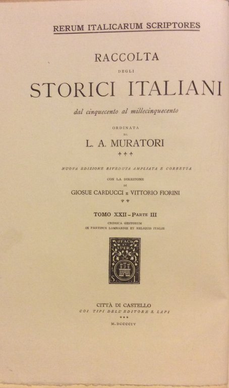 CRONICA GESTORUM IN PARTIBUS LOMBARDIE ET RELIQUIS ITALIE (AA. 1476-1482). - Rerum Italicarum Scriptores di L.A. Muratori - Tomo XXII, p. III.