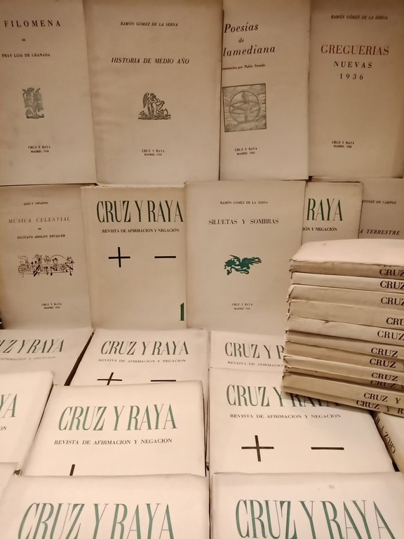 Madrid: Imp. S. Aguirre, 1933-1936.- 39 números + 8 apéndices con diversa paginación; 4º (23 x 16,5 cm); Ejemplares intonsos, conservando sus barbas; Rústica Ed.- RARA colección completa con los ejemplares sueltos, conservando su encuadernación original.* Cruz y Raya fue una influyente revista literaria española fundada por el escritor José Bergamín. Se caracterizó por su enfoque intelectual y su compromiso con la renovación cultural y literaria en España. Su lema, "Revista de afirmación y negación", reflejaba su propósito de debatir ideas, fomentar la literatura y explorar nuevas corrientes filosóficas y artísticas. Contó con la colaboración de destacados escritores y pensadores de la época, como Federico García Lorca, Rafael Alberti, Miguel de Unamuno y María Zambrano. Abordó temas de literatura, filosofía y política, con una marcada influencia del pensamiento católico y la tradición española, pero también con una apertura a corrientes vanguardistas. LITERATURA Y FILOSOFÍA ESPAÑOLAS DE LOS SIGLOS XIX-XXI Y SU HISTORIA EN GENERAL