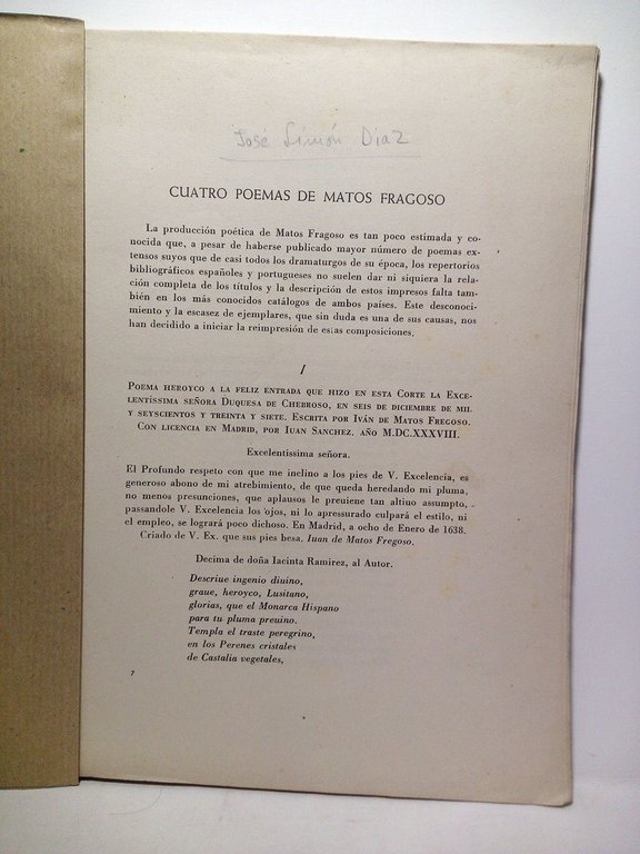 [S.l.]: [s.n.], [ca. 1955].- P. 97-161 (en total 65 pags.); 4º mayor (25,3 x 17,8 cm); Cubiertas provisionales.- Desglosado de alguna revista de la que no tenemos referencia.- Matos Fragoso, nació en el Alentejo hijo de Antonio Fragoso de Matos y Ana de Souza. Se licenció en Filosofía y Jurisprudencia en la Universidad de Évora, más tarde se estableció en Madrid, donde entabló amistad con los dramaturgos más famosos de la época, especialmente con Juan Pérez de Montalbán.* Al tratarse de un desglose carece de cubiertas y se le han puesto unas provisionales en papel. LITERATURA ESPAÑOLA Y FILOSOFÍA DE LOS SIGLOS XVI Y XVII