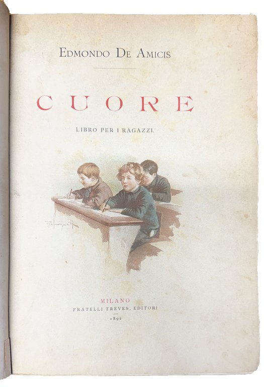 Prima edizione illustrata di uno dei testi fondativi della nazione italiana. Il “libro Cuore”, come dalla sua apparizione (Milano, Treves, 1886) in poi fu sempre chiamato, nacque come testo di lettura per le scuole, un romanzo per ragazzi formativo per la vita, fatto di buoni sentimenti e basato sui valori della scuola, della famiglia e della patria. De Amicis riuscì genialmente a mescolare insieme vari generi: il diaristico (la cronaca giornaliera degli avvenimenti di una classe torinese dell'anno 1881-‘82 è narrata attraverso il diario del protagonista, Enrico Bottini); l'epistolare (le lettere che Enrico riceve dal padre, dalla madre e dalla sorella contengono riflessioni morali che mettono in risalto il ruolo fondante della famiglia); e il racconto sotto forma di letture educative. Il 15 ottobre 1886, data di inizio dell'anno scolastico e del romanzo, Cuore uscì nelle librerie di tutta Italia. Il 28 ottobre si era già alla diciottesima edizione, ossia erano già state vendute diciottomila copie. Tra il 1887 e il 1893 fu tradotto in tredici lingue. Nel 1923 le copie vendute superarono il milione.