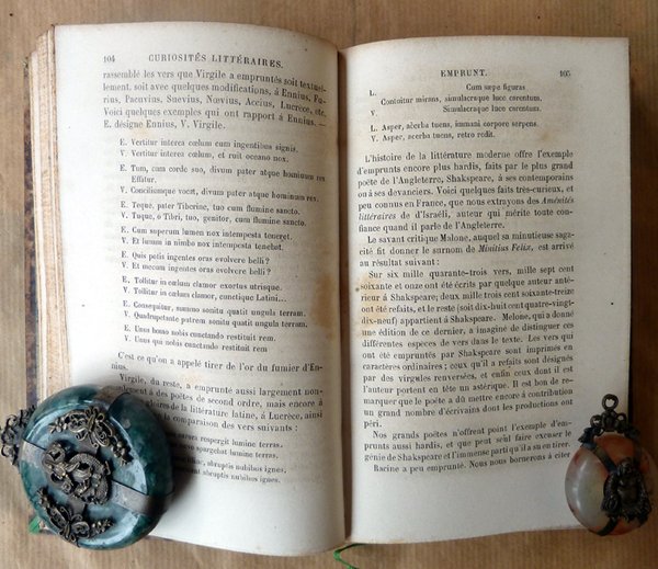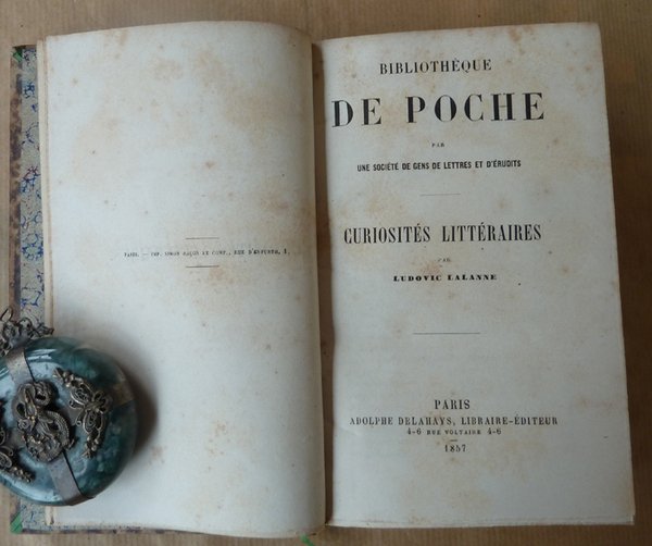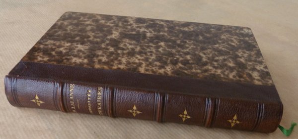 Un volume de format in 12 de VIII; 440 pp.; reliure de l'époque en demi chagrin brun; dos à 4 nerfs; fleurons et titre doré. Quelques rousseurs; sinon parfaitement relié. Du plagiat; des monogrammes; des amphigouris; des vers lettrisés; des querelles; des traducteurs. Charmant exemplaire. Voir photos. Réf. Vicaire I; 769 pour le première édition chez Paulin; non citée par Vicaire chez Delahays.