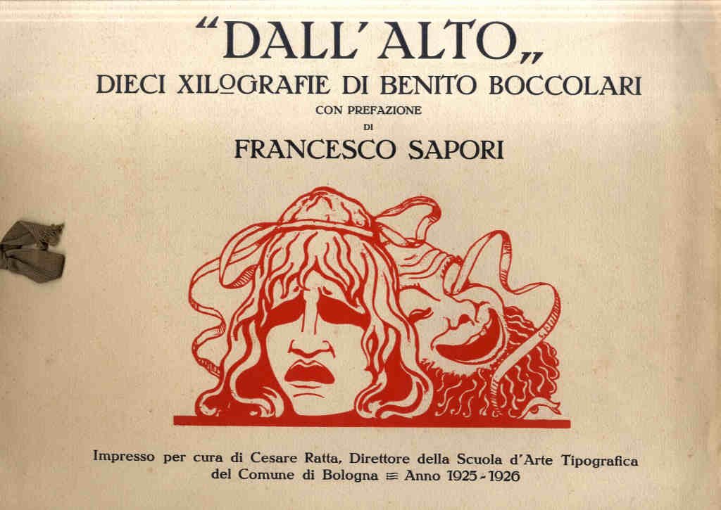 >In-folio oblungo (mm 350x440, pp 31, [3] con 10 tavole xilografiche a piena pagina protette da veline. Brossura editoriale in cartonato con nastrino, incisa dall'autore a due colori, titolo in nero e xilografia in rosso. Esemplare n.120/300 firmato a penna da Benito Boccolari. Le 10 tavole sono così intitolate: la curiosità, la serenata, La fiera, la folla, Il cimitero, Il suicidio, la rete, La processione, la guerra, il campanile. L'album "Dall'alto", rimane uno dei più interessanti lavori di Boccolari. Belle impressioni, ampi margini, accresciuta di due xilografie rispetto all'edizione del 1922 uscita con il titolo: Dall'alto op. N.1: otto silografie di Benito Boccolari. L'autore fu allievo di Bistolfi, partecipò all'Esposizione Nazionale d'Arte di Brera con le xilografie "La guerra" e "La serenatà";