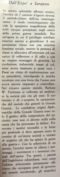 L'epoca storica i cui ultimi anni costituiscono l'argomento di questo libro non morì di vecchiaia né di morte accidentale, ma esplose in una crisi finale che costituisce uno dei fatti più importanti della storia. La Grande guerra del 1914-1918, come una striscia di terra bruciata, divise due epoche, creando un abisso psicologico e materiale tra di esse. Questo libro tenta di scoprire le caratteristiche del mondo che fu artefice del primo conflitto mondiale. Al di là di quel tortuoso strascico di trattati, di Duplici e Triplici Alleanze, crisi marocchine e intrighi balcanici, che gli storici hanno diligentemente seguito nei loro studi sull'origine della guerra, Barbara Tuchman ricerca le cause recondite e le forze più profonde entro la cornice della società intera per tentare di scoprire ciò che spinse la gente alla guerra.