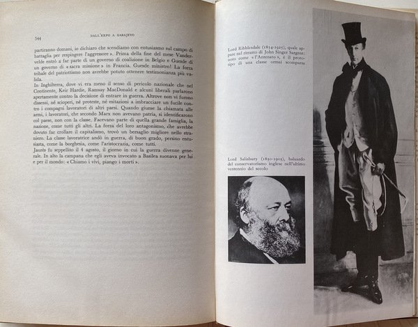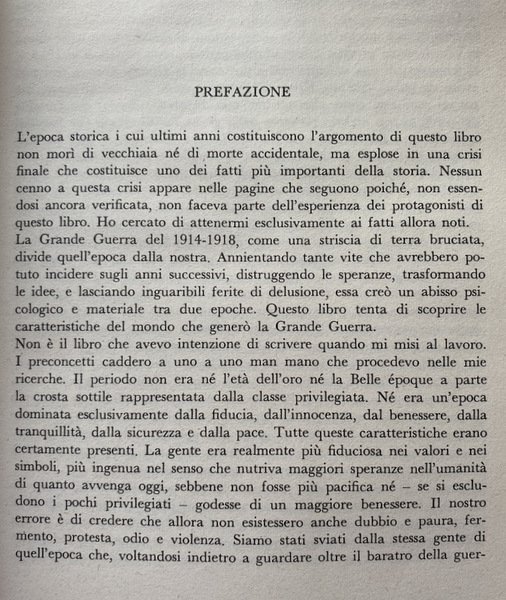 Soggetti: Europa, Storia contemporanea, Fine secolo, Novecento, Ottocento, 1895-1914, Grande Guerra, Prima Guerra Mondiale, Sarajevo, Omicidio, Attentato, Mobilitazione generale, Austria-Ungheria, Impero austroungarico, Prussia, Alleanze militari, Imperialismo, Competizione, Grandi Potenze, Irredentismo, Maggio radioso, Agosto 1914, Telegramma Zimmermann, Germania, Guglielmo II, Messico, Stati Uniti d'America, Conflitti, Crisi, Memorie, Documenti, Fotografie d'epoca, Illustrazioni, Libri illustrati, Saggi storici, Cronologia, Riferimento, Consultazione, Bibliografia, Storiografia, Critica, Interpretazioni, Origini, Cause scatenanti, Manifestazioni, Pacifismo, Ideologie politiche, Suicidio dell'Europa, Fronte occidentale, Balcani, Belle Époche Époque, Cancellerie, Diplomazia, Società, Salotti, Balli, Aristocrazia edoardiana, Anarchici, Germania, Richard Strauss, Balletto russo, Diaghilev, Musica, Stravinsky, Affare Dreyfus, Conferenze per la Pace, Aia, Ideali, Tragedia, Socialismo, Jean Jaurès, The Guns of August, Storia militare, Borghesia, Militarismo, Scioperi, Proteste, Politica estera, Privilegi, Sicurezza, Grosse Politik, Poincaré, Diplomatici, Sergej Sazonov, Russia, Inghilterra, Gran Bretagna, Italia, Francia, Rivalità economiche, Trasformazioni, Mentalità, Industria bellica, Ricchezza, Benessere, Classi sociali, Progresso, Fin de siècle, Decadenza, Feste private, Prosperità, Caste, Letterati, Poeti, Pittori, Circoli culturali, Intellettuali, Stampa, Editoria, Giornali, Comunicazione di massa, Stefan Zweig, Karl Krauss, Febbre, Follia collettiva, Regina Elisabetta, Giacomo I, Londra, Regno Unito, Impero britannico, Marina militare, Balfour, Churchill, Lady Elcho, Relazioni sociali, Vaillant, Jules Breton, Carnot, Verlaine, Mallarmé, Anarchia, Tailhade, Zola, Rodin, Processi politici, Condanne, Roosevelt, George Washington, Wilson, Ebrei, Vienna, Antisemitismo, Artisti, Karl Luger, Francesco Giuseppe, Arthur Schnitzler, Gustav Mahler, Cechov, Lavoro, Operai, Fabbriche, Condizioni economiche, Diritti, Marxismo, Povertà, Capitalismo, Miseria, Disuguaglianze, Somerset, Yorkshire, Bassifondi, Sindacati, Lavoratori, Salario, Proletariato, Lotta di classe, Coscienza, Riposo, Ore lavorative, Comunismo, Rivoluzione, Partito comunista, Internazionale, Lenin, Engels, Marx, Gustave Hervé, Guesde, Jean Jaurès, Poter, Neroismo, Stalin, August Bebel, Sindacalismo, Keir Hardie, David Lloyd George, Esposizione Universale, Bertha von Suttner, Alfred Nobel, Krupp, Acciaierie, Hohenzollern, Luigi Lucheni, Le Père Peinard, Sante Caserio, Gaetano Bresci, Umberto I di Savoia, Attentati, Bombe, Peter Kropotkin, Liberalismo, Conservatori, Riformismo, Champs Elysées, Sigmund Freud, Einstein, Max Planck, Carbon, Ferro, Acciaio, Ruhr, Energia, Koch, Chimica, Rivoluzionari, élite, Elettricità, Meccanica, Industrie chimiche, Edmond Paulin, Regicidio, Libri Vintage Fuor catalogo, Europe, Contemporary history, End of the century, Twentieth Nineteenth century, Great War, First World War, Murder, Attack, General mobilization, Austria-Hungary, Austro-Hungarian empire, Military alliances, Imperialism, Competition, Great powers, Irredentism, Radiant May, August, Germany, William II, Mexico, United States, Conflicts, Crisis, Memories, Documents, Photographs, Illustrations, Picture books, Historical essays, Chronology, Reference, Consultation, Bibliography, Historiography, Criticism, Interpretations, Origins, Causes Triggers, Demonstrations, Pacifism, Political Ideologies, Suicide, Western Front, Balkans, Chancelleries, Diplomacy, Society, Lounges, Dances, Parties, Edwardian Aristocracy, Anarchists, Germany, Russian Ballet, Peace Conferences, Aja, Ideals, Tragedy, Socialism, Military history, Bourgeoisie, Militarism, Strikes, Protests, Foreign policy, Privileges, Security, Diplomats, England, Great Britain, Italy, France, Economic rivalries, Transformations, Mentality, War industry, Wealth, Well-being, Social classes, Progress, Decadence, Private parties, Prosperity, Caste, Literati, Poets, Painters, Cultural circles, Intellectuals, Press, Publishing, Newspapers, Communication Mass, Fever, Collective madness, Queen Elizabeth, James I, London, UK, British empire, Navy, Social relations, Anarchy, Political trials, Sentences, Jews, Antisemitism, Artists, Franz Joseph, Jobs, Workers, Factories, Economic conditions, Rights, Marxism, Poverty, Capitalism, Misery, Inequalities, Slums, Unions, Workers, Wages, Proletariat, Class struggle, Consciousness, Rest, Working hours, Communism, Revolution, Communist party, International, Power, Blackism, Unionism, Universal Exposition, Steelworks, Savoy, Attacks, Bombs, Liberalism, Conservatives, Reformism, Iron, Steel, Energy, Chemistry, Revolutionaries, Electricity, Mechanics, Chemical industries, Regicide, Books Out of print