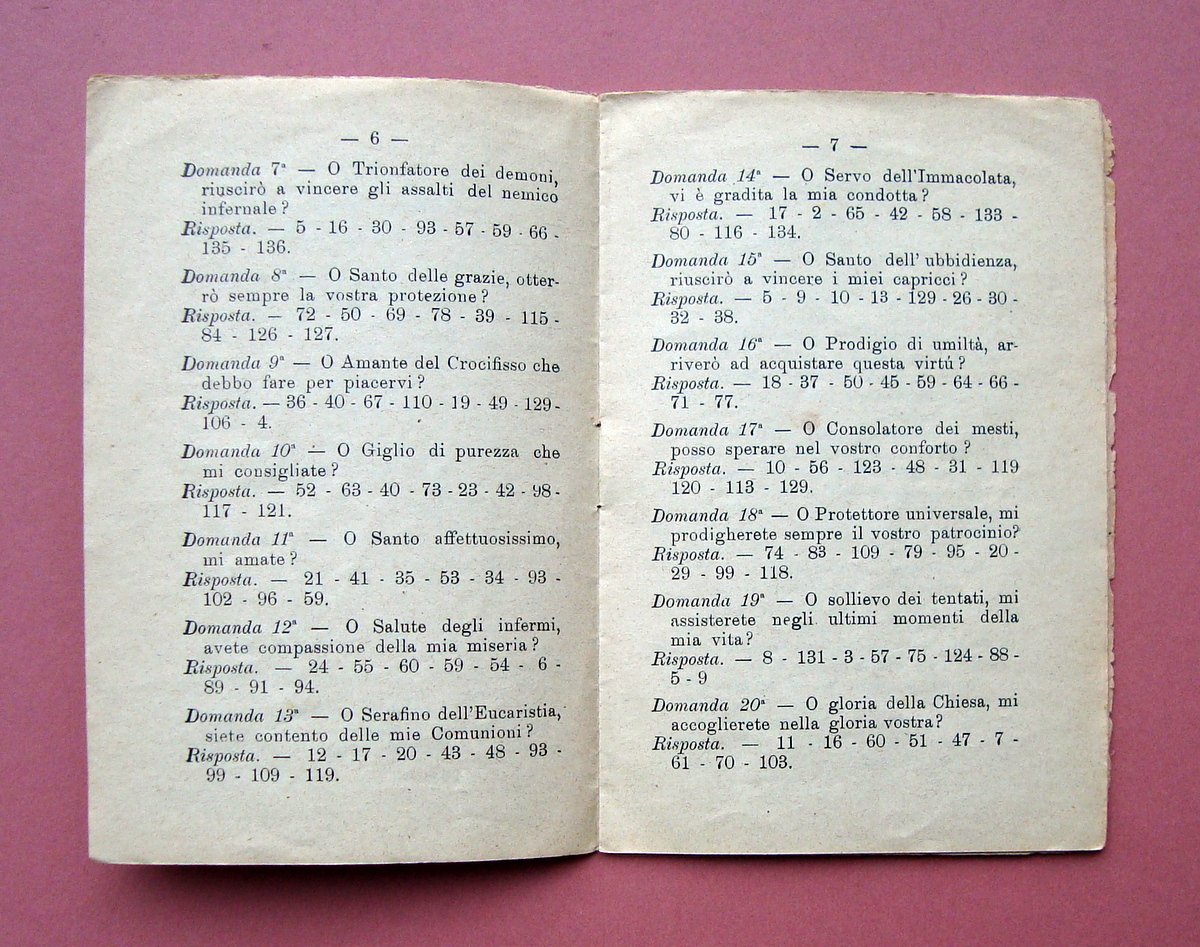 Damiani G.M., O S.Gerardo che volete da me? Tip. S. Gerardo Maiella, Materdomini; 1927; cm 15x10; pp. 16; libretto con domande e numeri correlati di risposte. Condizioni di conservazione Esemplare in buone condizioni con tracce del tempo; brossure con minuscole macchiette, leggere bruniture e piccolissimi strappetti ai margini; interni buoni. SC03.D19271 blu