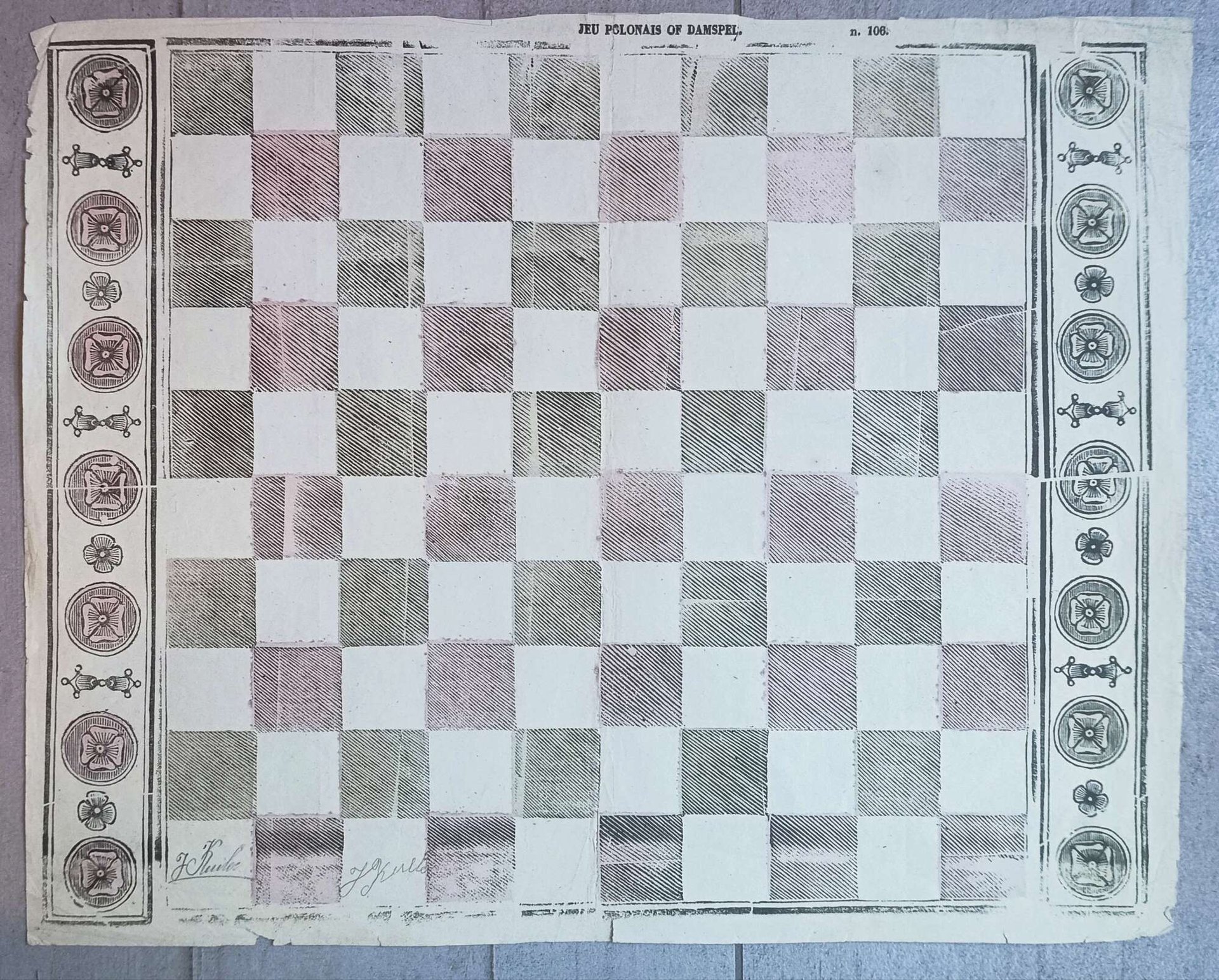 >Litografia colorata (mm 315x392), 1830 c.a. "Jeu Polonais of Damspel". Il gioco della Dama può avere una scacchiera di 64, 100 o 144 caselle. L'unica Dama che viene giocata con regole comuni in tutti i Paesi è la Dama internazionale, detta anche polacca (la presente), che si gioca su una scacchiera composta da 100 quadrati di cui 50 bianchi e 50 neri. La litografia presenta a sinistra e destra un bordo decorativo ornamentale. Decori e metà dei quadrati neri sono colorati di rosa con la tecnica "pochoir", che consiste nella realizzazione, sulla base delle aree da colorare, di stampini ritagliati e sagomati all'interno, con una tecnica, diremmo oggi, simile allo stencil. Titolo in alto, centrale; a destra "n. 106". Piccoli difetti lungo il margine inferiore, dovuti all'estrema deperibilità dei fogli, per la destinazione popolare. Note di possesso entro due riquadri, in basso. Raro.
