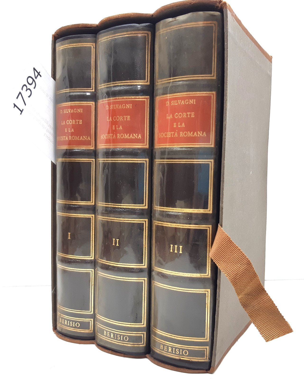 Cofanetto rigido editoriale in discrete condizioni, una rottura al margine superiore di circa 5 cm, lievi segni del tempo, sovraccoperta in acetato in discrete condizioni, lievi segni del tempo, al primo volume una rottura al margine inferiore della quarta di copertina, legatura rigida in mezza pelle con piatti cartonati dorso in pelle con tasselli e titolo in oro, tagli ingialliti con fioriture, impolverati quelli superiori, interno in buono stato, traccia di dedica a matita al frontespizio del primo volume, numero pagine 428 + 558 + 543, dimensioni cm 23 * 14,5 * 14