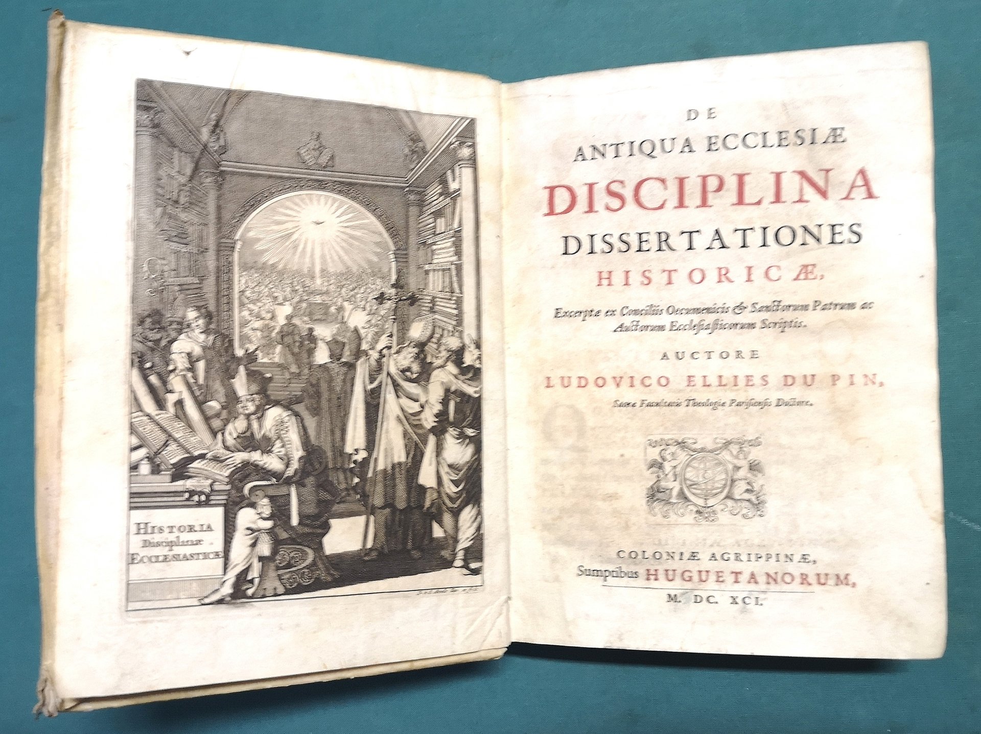 >in-4 picc., pp. (22), 592, (8) di indici, bella antiporta incisa, marca al frontespizio, testatine e finalini in xilogr. Legatura coeva in p. pergamena con unghie (mancanza al piatto post. e al dorso), tagli spruzzati di rosso. Du Pin fu autore di un'importante e monumentale storia della letteratura ecclesiastica (Nouvelle bibliothèque des auteurs ecclésiastiques, 1686-1714), che suscitò aspre polemiche per la dichiarata professione gallicana e la quasi esplicita polemica contro l'assolutismo romano. Apologeta del gallicanesimo (la dottrina ecclesiastica che sostiene la restrizione del potere papale), Dupin fu esiliato a Châtellerault, con l'accusa di giansenismo, dopo aver protestato contro la bolla Unigenitus di papa Clemente XI e perse la sua cattedra al Collège de France. La presente opera fu all'indice fino al 1948. Buon esemplare, assai fresco (lieve alone d'umido al margine esterno degli ultimi fogli).