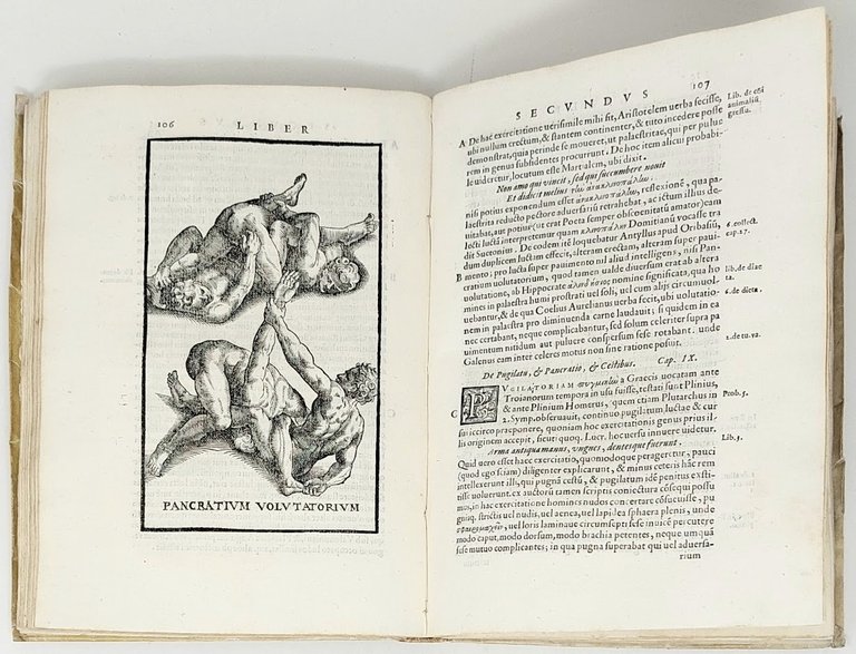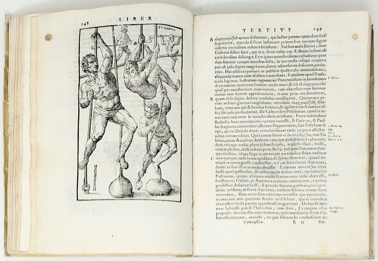 >in-4 (235x168 mm), pp. (12), 308 (ma in effetti 312 per numerazione ripetuta alle pp. 53-54 e 55-56), (26), legatura coeva in pergamena molle con unghie, titolo manoscritto al dorso con antichi restauri. Impresa tipografica al titolo, fregi ed iniziali in xilografiche. Dedica all'imperatore Massimiliano II. Terza edizione giuntina, dopo la prima del 1569 (illustrata con una sola tavola f.t. incisa in rame) e la seconda del 1573 riccamente illustrata; di quest'ultima ripete le 23 bellissime figure xilografiche a piena pagina ed una piccola figura a pag. 166, disegnate dall'autore stesso e da Pirro Ligorio ed incise in legno da Cristoforo Coriolani: esse raffigurano palestre, bagni, giochi ed esercizi ginnici, competizioni ed attrezzi. L'autore (1530-1606), medico di Forlì, fu tra i primi che nel XVI sec. cercò di ristabilire l'educazione fisica della gioventù. Ottimo esemplare (forellini di tarlo al contropiatto e alla sguardia anteriore). Camerini, Giunti di Venezia, I, n. 930. Durling 3090. Garrison-Morton n. 1986.1 (ed. 1569): «First illustrated book on gimnastics. It is the foundation-stone of later works on the subject and it is important for the study of gymnastics among the ancient...». Wellcome I, 4226. Govi, Classici, 121 (ed 1573).