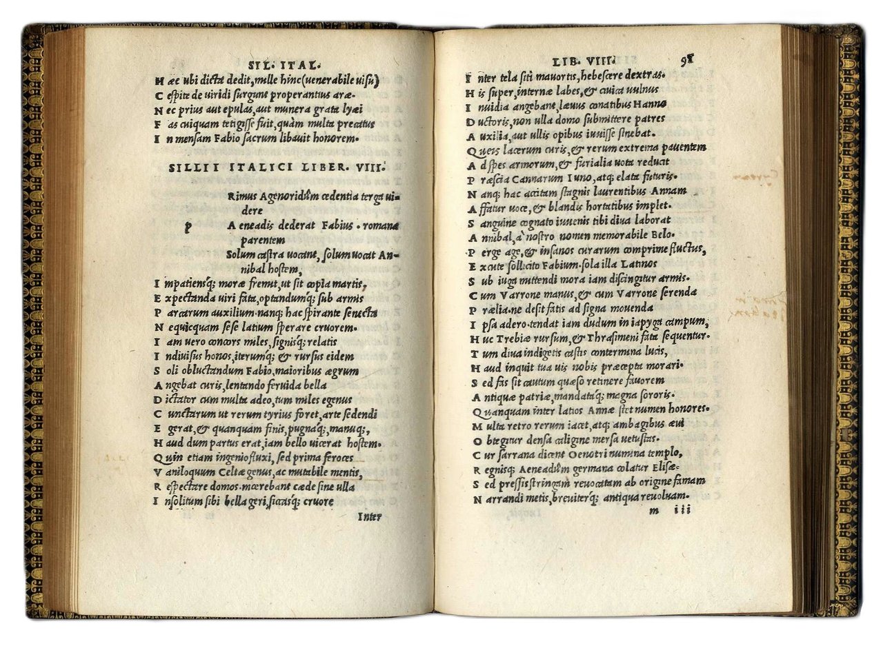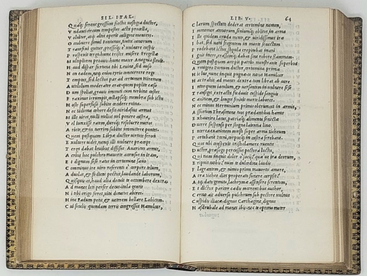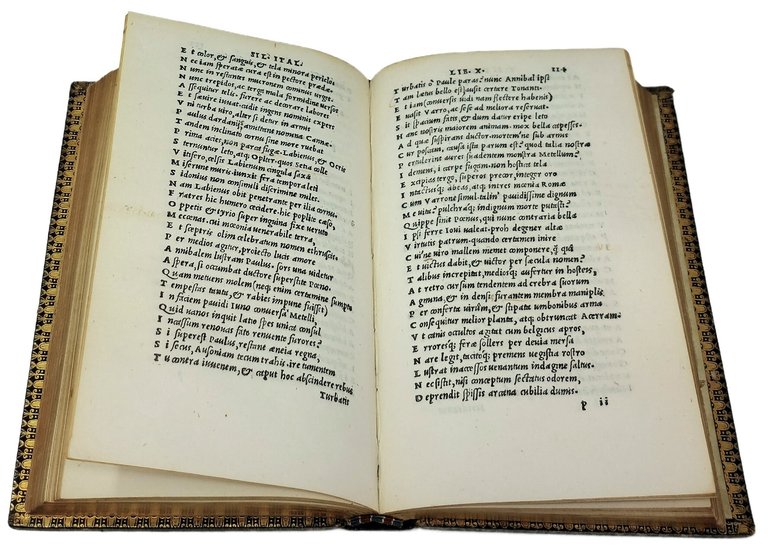>in-8 (165x100 mm), ff. 210, (2, colophon e àncora), legatura inglese del XIX secolo in pieno zigrino nero, ancora aldina impressa in oro su entrambi i piatti, dorso a nervi con titoli oro, tagli dorati, dentelles. Ancora aldina al titolo ed in fine, spazi con lettera-guida per le iniziali. Precedono la dedica di Francesco Asolano al cardinale Innocenzo Cibo e la Vita dell'autore scritta da Pietro Crinito. Prima ed unica edizione aldina, considerata anche la prima edizione completa di quest'opera in quanto contiene gli 84 versi, pochi anni prima scoperti in Francia, inseriti dopo il verso 140 del libro VIII e conservati in tutte le edizioni posteriori, benché di dubbia appartenenza a Silio. «Punica» è il noto poema epico latino in 17 libri sulle vicende della seconda guerra punica, composto da Silio Italico (25-101 d.C.), letterato ed uomo politico, console nel 58 e proconsole dell'Asia 10 anni dopo. Ottimo esemplare. Ex libris di Charles Walker Andrews (1861-1946) al contropiatto superiore. Renouard 98.6. : «édition peu commune». UCLA n. 194. BMC 627. Adams S-1134.