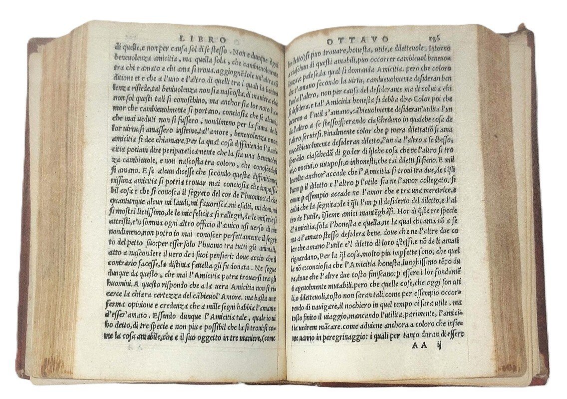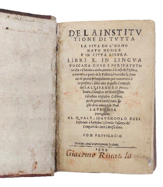 >in-8 (157x106mm), ff. 274, (5), bella legatura coeva veneziana in p. pelle con impressioni vegetali e volute a secco al piatto anteriore, titolo impresso sempre a secco al dorso a 5 nervi. Capilettera abitati xilografici; indice e registro finali. Antica firma al titolo. Seconda edizione (la prima apparve presso il medesimo stampatore 2 anni prima) di uno dei maggiori trattati dell'umanista senese, sorta di manuale d'istruzione per i giovani gentiluomini spaziante dalla filosofia (di orientamento aristotelico) all'etica, dal pensiero politico all'economia alla cura della famiglia, dalla retorica alla poetica alla musica. Il Piccolomini (1508-1579) fu letterato, ecclesiastico, commediografo di buon livello, poeta, lettore di filosofia morale a Padova, membro dell'Accademia degli Infiammati, divulgatore, traduttore e commentatore di Aristotele in volgare, nonché volgarizzatore di altri classici, da Senofonte a Ovidio a Virgilio. Esemplare con antica nota di possesso al titolo "Giacomo Rivarola" e con alcuni disegni e sottolineature a lapis rossa, piccolo alone marrone scuro nel margine superiore bianco di 2/3 del volume (che non tocca mai il testo). Nel complesso buon esemplare. Adams, P-1107. STC Italian, p. 513. Brunet, IV, 632. Graesse, VIII, 281. Fétis, VII, 51. Gamba, 1577 (nota): E una delle Opere più pregevoli e meglio scritte del Piccolomini. Olschki, Choix, 1806.
