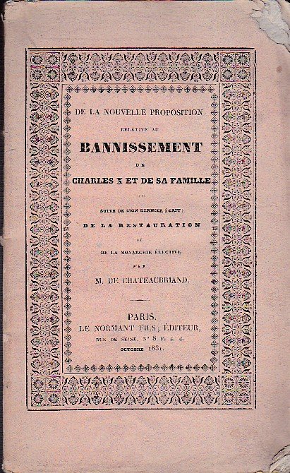 In-8°, pp. 120, brossura editoriale rosa con titolo racchiuso entro bordura ornamentale. Ottima copia in barbe. Edizione originale. Nel pamphlet, sèguito di De la Restauration et de la Monarchie élective, Chateaubriand si scaglia contro la proposta di messa al bando di Carlo X e dei suoi discendenti, dopo la deposizione del sovrano in seguito alla Rivoluzione di Luglio del 1830; tale proposta era stata letta alla Camera nelle tornate del 14 e del 17 settembre 1831 e quindi sottoposta all'esame di un'apposita commissione: 'Autant de fois qu'on renouvellera des actes de violence contre la famille déchue, autant de fois je m'élèverai contre ces actes'. Talvart / Place, III, 13. Louandre / Bourquelot, II, 599.