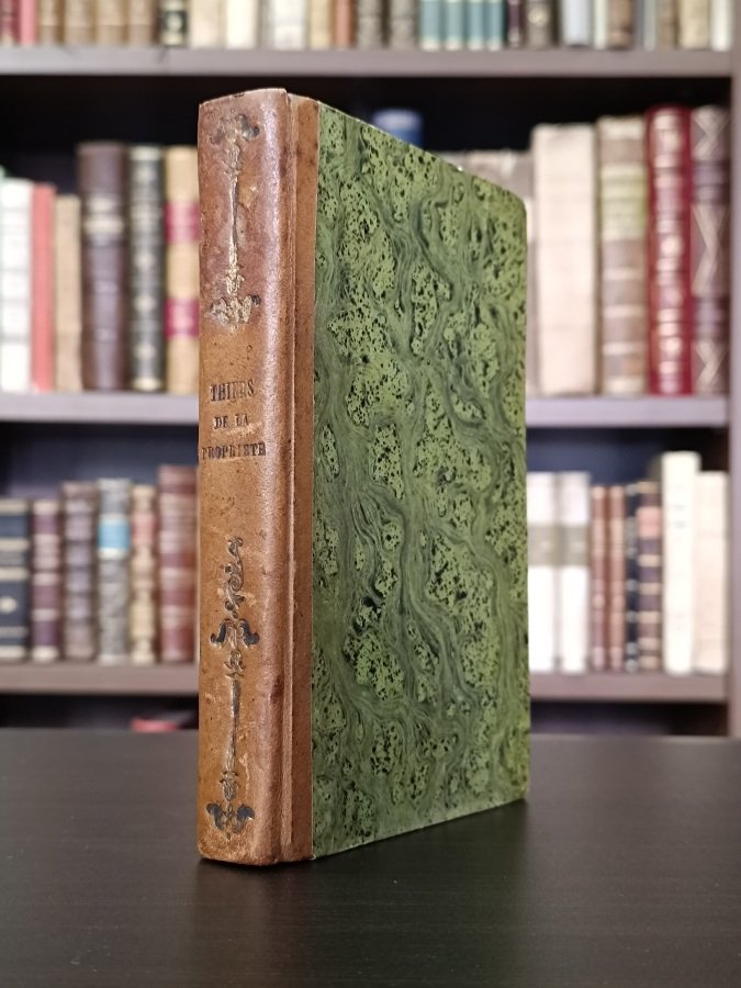 In-16° (cm. 17,4), legatura coeva in mezza pelle nocciola, dorso liscio con titolo e fregi romantici in oro (lievissime tracce d'uso), piatti marmorizzati; pp. 355 [1b] in stato molto buono; sporadiche fioriture. Stimata edizione di questa celebre opera dello storico ed economista francese sostenitore del diritto di proprietà. Esemplare molto buono. (NA7)