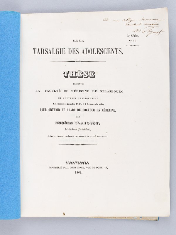 De la Trasalgie des Adolescents [ Edition originale - Livre dédicacé par l'auteur ] Thèse présentée à la Faculté de médecine de Strasbourg et soutenue publiquement le 4 janvier 1868