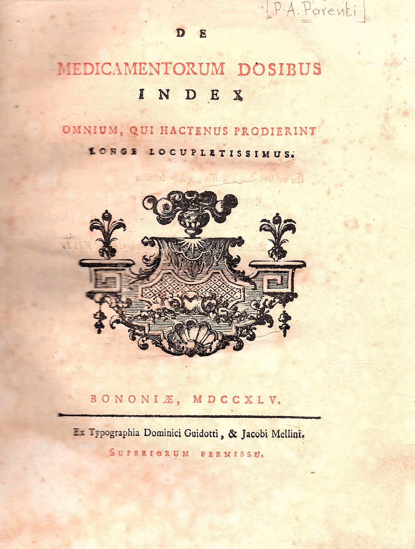 In-4° antico (26x20 cm), pp. 244, (4) di cui due di errata e due bianche, cartonatura alla rustica coeva con titolo manocritto su tassello cartaceo al dorso in carta spruzzata coeva. Frontespizio stampato in rosso e nero con fregio silografico così come, finali e testate (alcuni animati). Alcune carte con lievi fioriture e bruniture, una piccola macchia evanescente a pp. 151-52 non lambente il testo, qualche carta un poco stanca ma nel complesso più che buon esemplare genuino. Prima non comune edizione di questo esteso repertorio sulle dosi dei medicamenti semplici e di quelli composti, ricco di nozioni di botanica e di chimica. Si pensi che già all'epoca era ben noto ad esempio il valore depurativo del succo di Aloe oltre a rimedi tipici delle terre felsinee. Il Parenti, nato in data incerta tra il 1698 e il 1701, morto nel 1771, è noto precipuamente per la presente opera. Cfr. Blake, p. 338. Wellcome, II, 438.