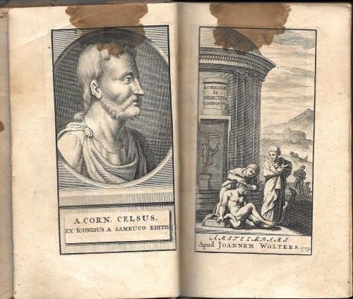 in 16°, pp. ritratto e antiporta incisi in rame, 44 nn., 574, 24 nn. di Index rerum et verborum, 4 b.; bella leg. coeva p/cuoio, ds. a 5 nervi con tit. in oro, cornici e fregi a secco ai piatti, front. in rosso e nero con vignetta incisa. Ciò che ci è pervenuto dell'enciclopedista latino, vissuto a Roma intorno al 25 d.C., è quest'opera di compilazione e rielaborazione di vari testi di medicina ippocratea e latina, in cui l'A. cerca di fondare la medicina sull'osservazione empirica congiunta all'approccio razionale; dopo aver sfrondato la medicina dalle pratiche magiche e superstiziose, accenna alla sua suddivisione in tre sottodiscipline; dietetica, farmaceutica e chirurgica, e coerentemente, negli otto libri, suddivide le malattie a seconda che richiedano l'intervento del dietologo, del farmacista o del chirurgo. Opera organica e intelligente, ricca di informazioni su nutrizione, attività fisica, patologia, anatomia, farmaceutica, trattamento delle lesioni interne ed esterne, tecniche chirurgiche, malattie delle ossa, con 2 tavv. in rame n.t. La prosa scientifica di C. divenne un modello di riferimento per i secoli successivi per opere mediche e non. Macchia scura interessa il margine superiore del 1° quarto del vol. diminuendo fino a sparire, lievi arrossamenti, mancano la cuffia sup., il capitello e la cuffia inf. 335/30