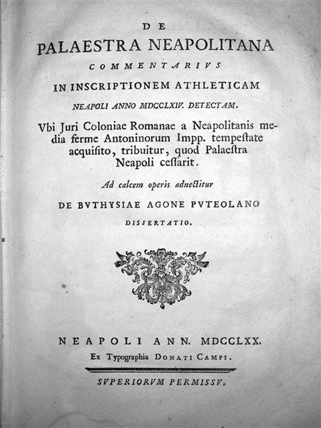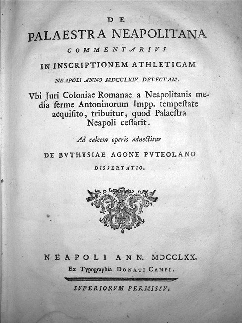 DE PALAESTRA NEAPOLITANA commentarius in inscriptionem athleticam in Neapoli anno MDCCLXIV detectam. Ubi iuri coloniae romanae à Neapolitanis media ferme Antoninorum Impp. tempestate acquisito, tribuitur, quod Palaestra Neapoli cessarit. Ad calcem operis adnectitur De Buthysiae agone Puteolano dissertatio.