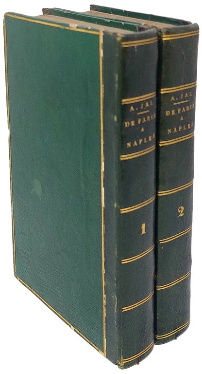 >2 voll. in-8, pp. (4), XVI, 444; (4), 512; leg. del tempo m. pelle verde, tit. e filetti oro ai dorsi. Prima edizione di un interessante resoconto di viaggio in Italia dalla Costa Azzurra, alla Liguria, le principali città dell'Italia del nord e del centro, sino a Napoli. L'autore (1795-1873), storiografo e archivista del Ministero della Marina francese, scrisse numerose opere storiche e di argomento nautico. In questa egli dimostra di esere ottimo osservatore di usi e costumi e buon conoscitore dell'arte e della letteratura italiane e termina con frasi d'ammirazione per il nostro paese: «...allez dans toute l'Italie! Il n'y a pas un petit endroit de l'Italie qui ne mérite qu'on ne le voie». Manca a Fossati - Bellani.