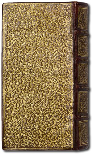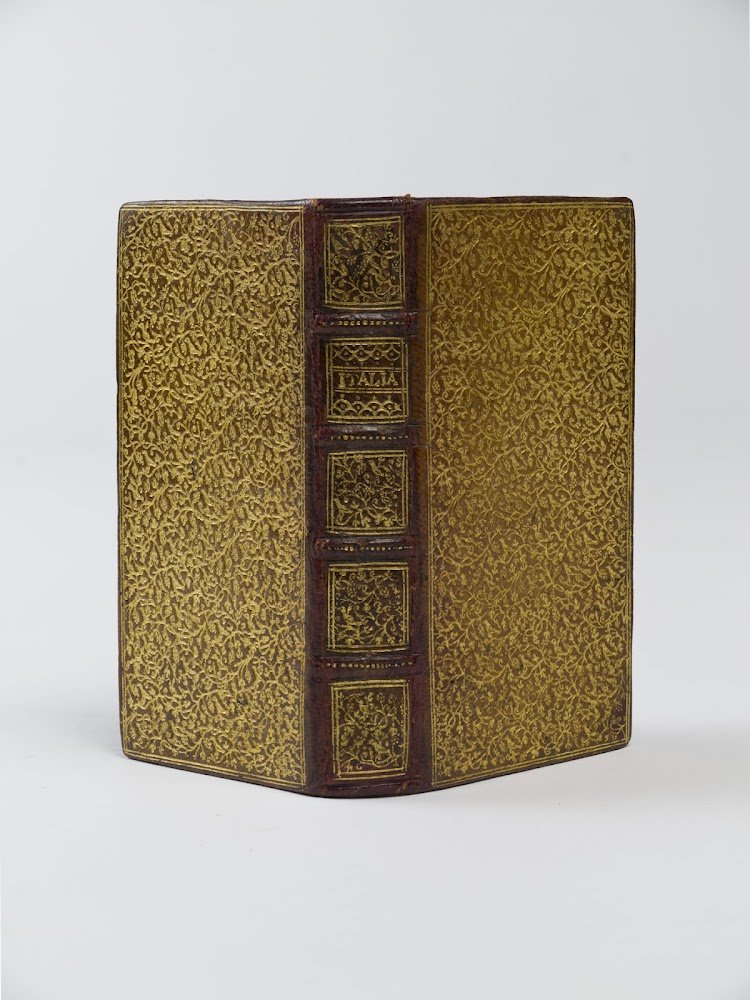 >in-24 (110x55 mm), pp.372, (8), 2 ff. bianchi (una minima bruciatura a uno degli ultimi ff.). Deliziosa elegantissima rilegatura dell'epoca in marocchino biondo, i piatti interamente decorata da una fittissima doratura di volute e uccellini di piccolo formato, dorso a 5 nervetti con decorazione simile degli scomparti; il secondo reca con grande eleganza il solo titolo in capitali "ITALIA", tagli dorati; preservata in camicia e bell'astuccio in marocchino marrone con titoloin oro.