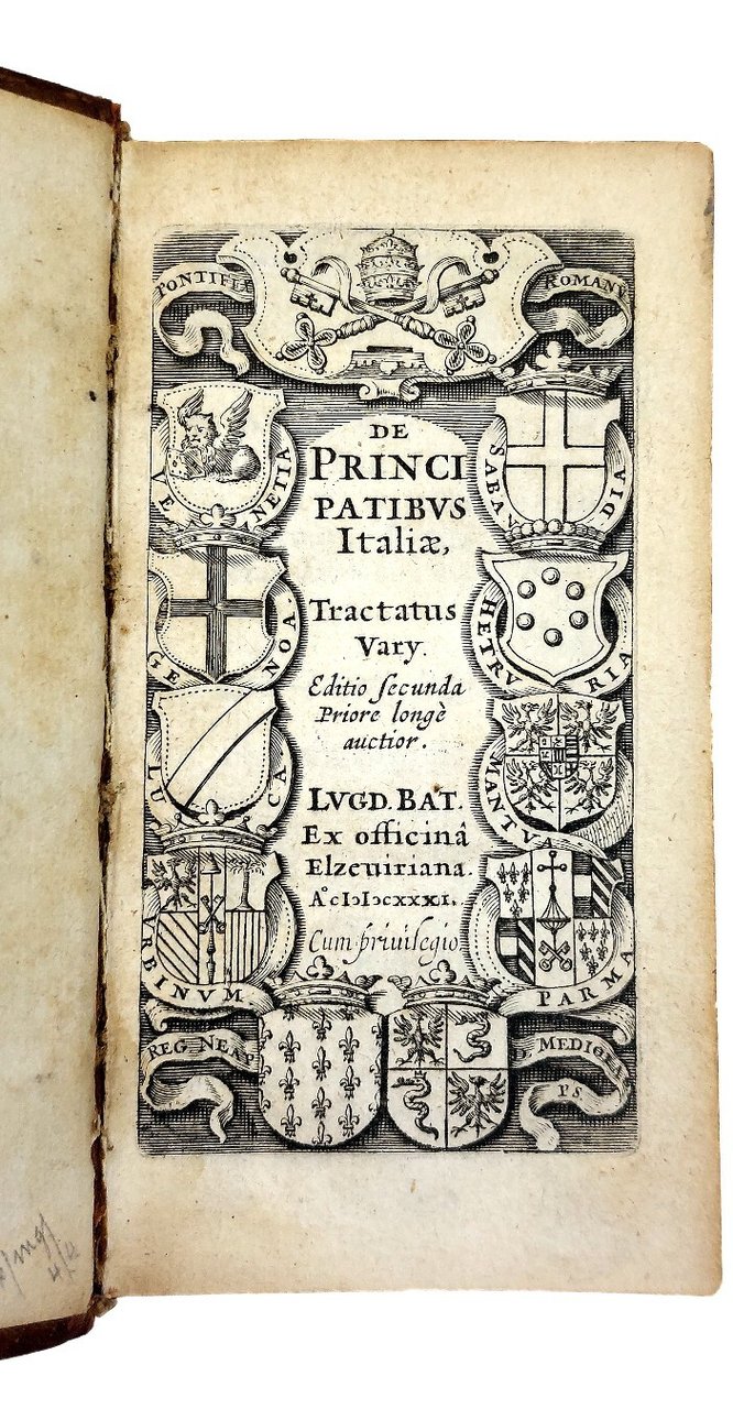 Seconda edizione, ampliata del De Pontifice Romano, di una delle celebri Repubbliche Elzeviriane. Bel titolo inciso entro bordura con gli stemmi del Papato e di 12 stati della penisola. "L'edizione originaria di questa Repubblica era apparsa nel 1628 […] Esistono sotto la data del 1631 due distinte edizioni; contengono entrambe un trattato a p. 59-89 , che manca in quello del 1628" (Willems 356). A partire dal 1626, i grandi editori di Leyden intrapresero la pubblicazione sistematica di preziosi libelli in-24°, chiamati correntemente per il loro formato "le Repubblichine Elzeviriane" Iniziarono con la Respublica Venetorum di Gasparo Contarini, poi proseguirono sistematicamente con la descrizione di molti altri stati europei. La collana precedette ed accompagnò nella cultura europea l'affermarsi del repubblicanesimo, in effetti una realtà complessa che ha sfidato l'assolutismo monarchico. I numerosi volumetti impressi con grande eleganza non potevano mancare in nessuna biblioteca importante, erano di facile esportazione e di basso prezzo. Il volume riunisce brevi trattati storico-politici di Cluverio, Bodin, Guicciardini e Botero sui diversi principati della penisola e fu tradotto da Thomas Seget (1569-1627), poeta scozzese che componeva in latino e si convertì dal Calvinismo al Cattolicesimo. Fu in contatto con Galileo. Volumetto rarissimo a reperirsi in una rilegatura di eccezionale qualità come la presente, appartenuta al grande bibliofilo Raphaël Esmerian (ex-libris nell'astuccio. Suo catalogo, vol. II, 1972, n° 78 "très curieuse et jolie reliure", riprodotta a p. 116). Willems, 356.