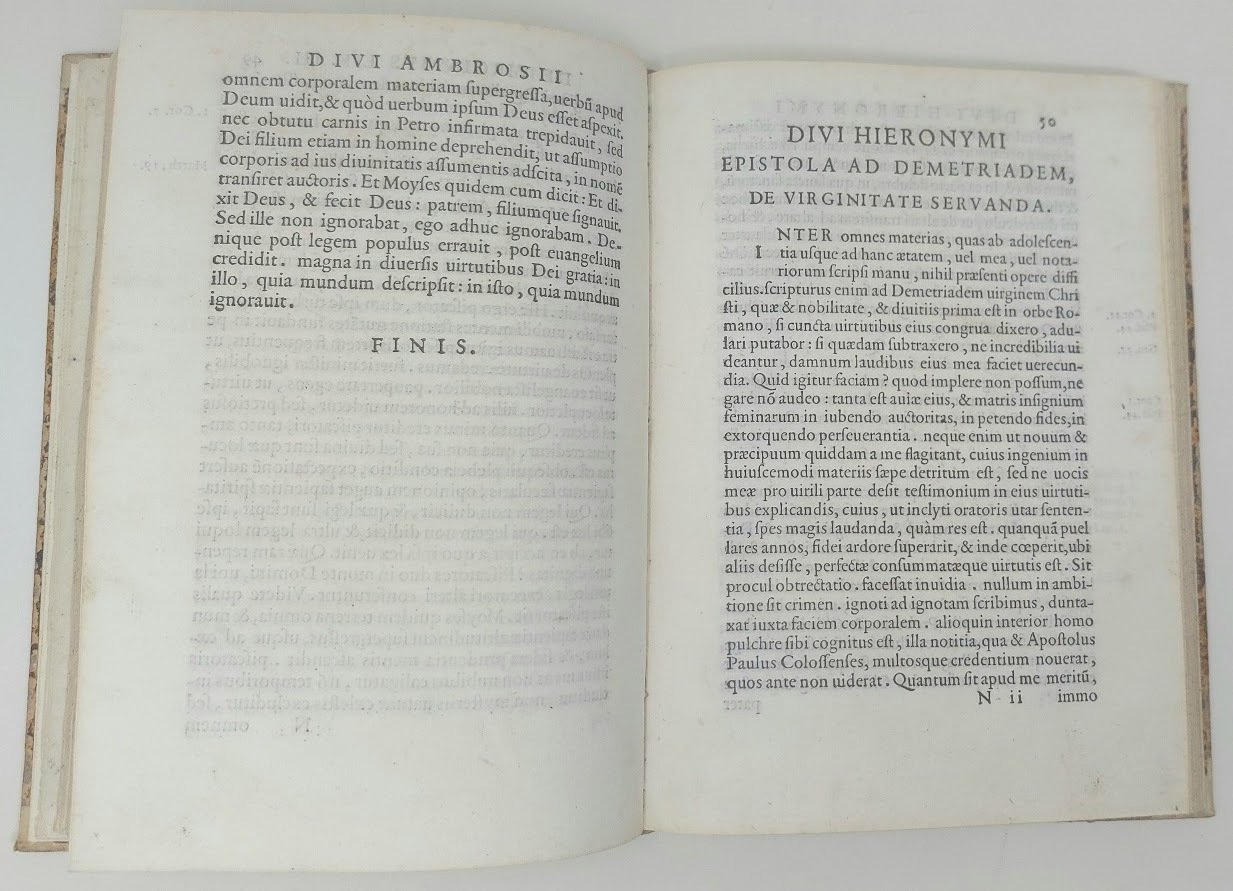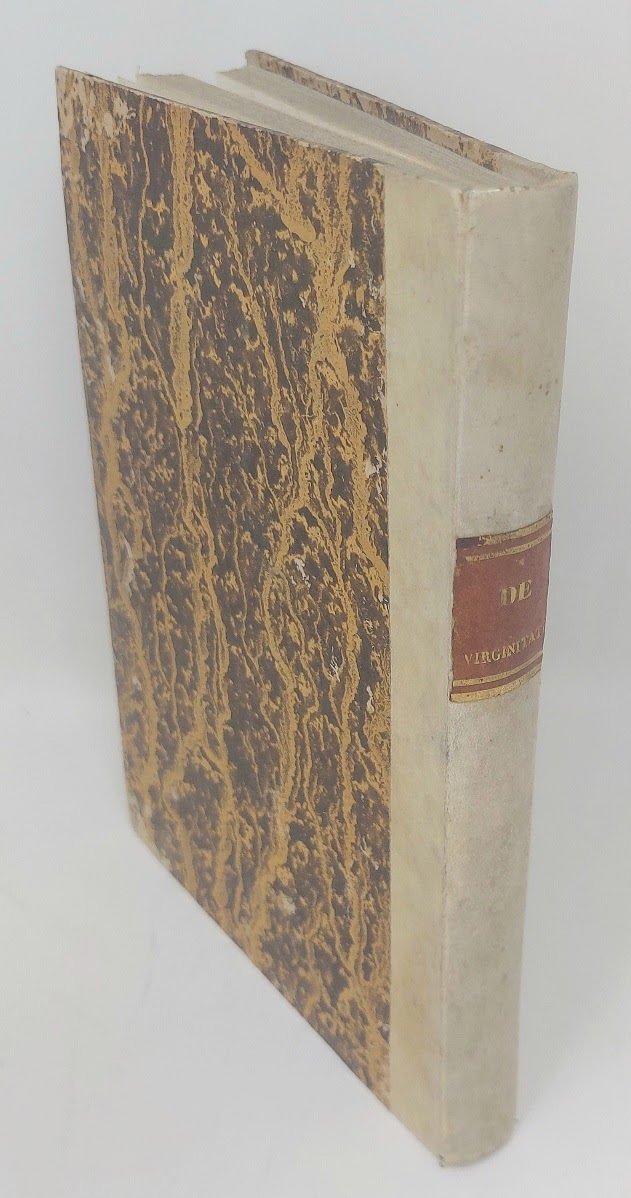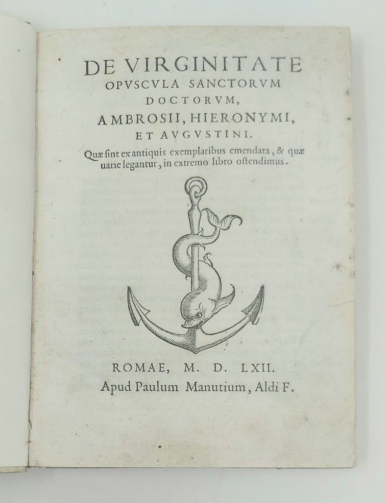>in-8 (195x140 mm), ff. 109, (7), legatura ottocentesca mezza pergamena, titolo oro su tassello al dorso. Marca tipografica al frontespizio., bel carattere romano. Prima edizione di questa raccolta di tre importanti trattati morali sulla verginità dei tre grandi dottori della Chiesa; gli ultimi fogli contengono le correzioni filologiche apportate a questi antichi testi. I tre libri del ''De virginibus'' di Sant' Ambrogio, il grande vescovo di Milano del IV sec., abbracciano i primi 49 ff.; seguono il ''De virginitate servanda'' di S. Girolamo ed il ''De sancta virginitate'' di S. Agostino. Pregevole edizione del figlio del grande Aldo Manuzio. Bell'esemplare. Renouard 186.7. STC 25.
