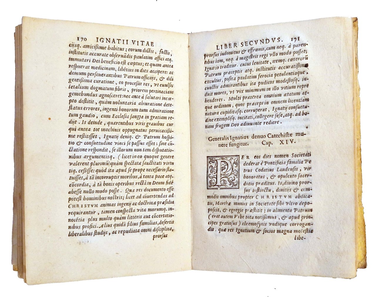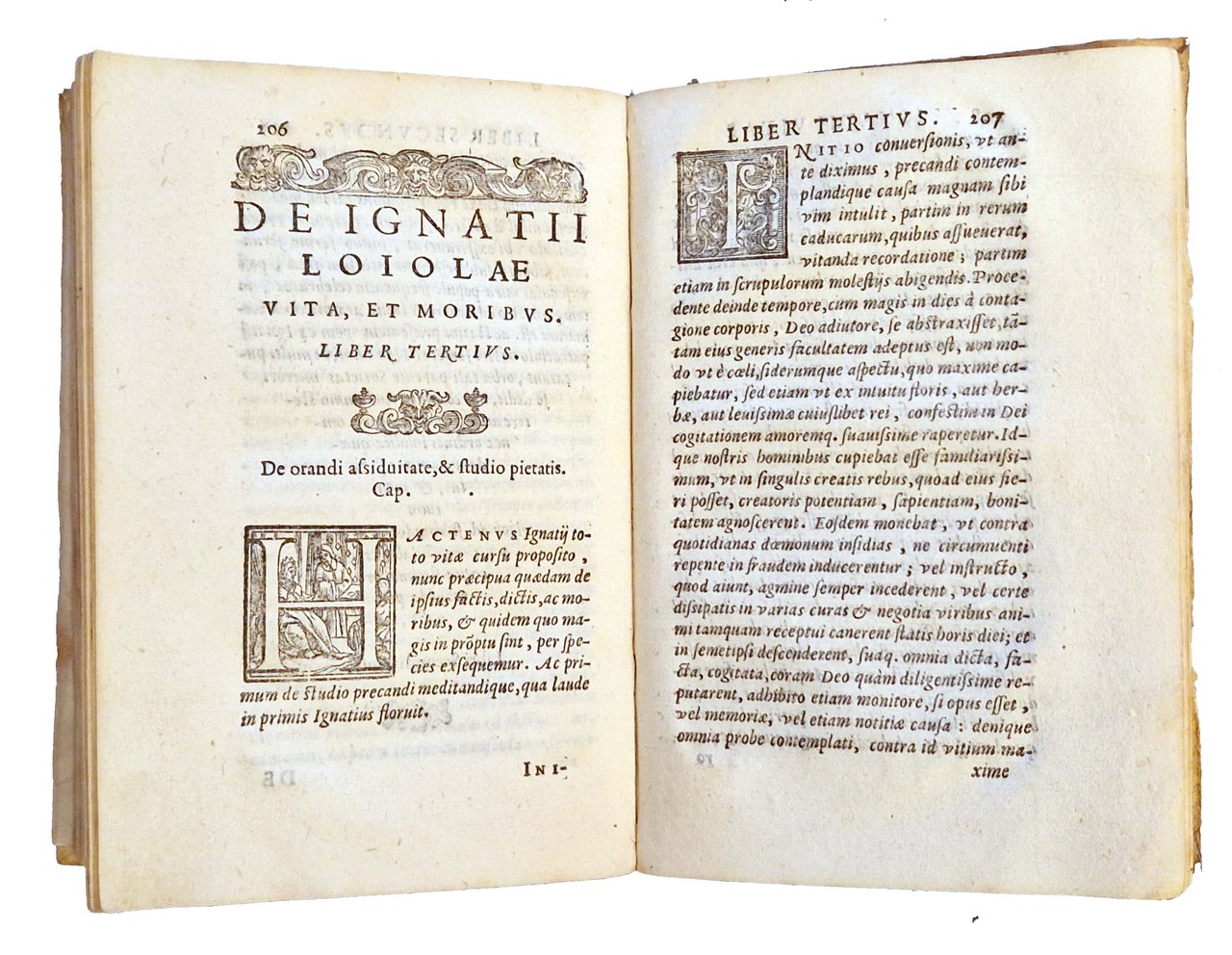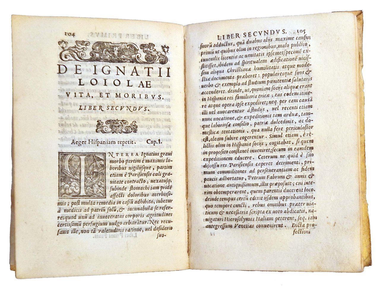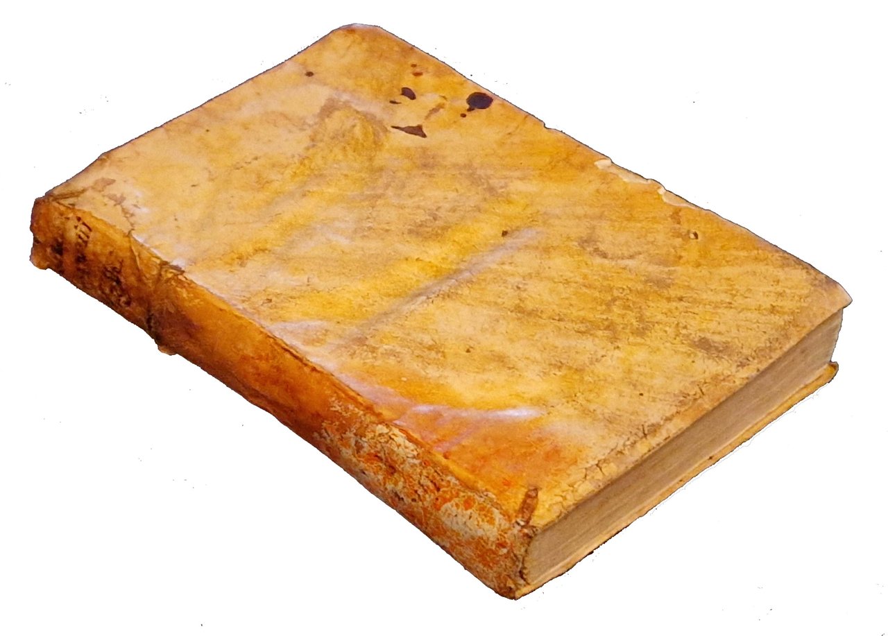 in-8°, 158x106 mm, leg. coeva in pergamena morbida, titolo manoscritto al dorso; pp. [24], 286, [2]. Testo in corsivo, romano; titolo inquadrato da cornice xilografica figurata, e testate e capilettera istoriati. Marca xilografica dello stampatore (Gabriel Giolito de Ferrari) al frontespizio (in cornice figurata: fenice sopra le fiamme che escono da un'urna; motto: De la mia morte eterna vita io vivo; motto: Semper eadem; iniziali: GGF) e al colophon (fenice su fiamme che si sprigionano da globo alato recante le iniziali G.I.F.; alla base di una cornice architettonica con quattro puttini). Pagina 219 erroneamente numerata 119. Prima edizione di questa biografia di sant'Ignazio di Loyola, a cura dello scrittore gesuita Giovanni Pietro Maffei (1533-1603). Rif.: IT\ICCU\BVEE\005163. OCLC, 1403726626. Cond.: Forti segni d'uso alla legatura (macchia di colore rosso grasso alla parte inferiore del dorso, piccole macchie, abrasioni, mananze marginali al taglio anteriore, titolo sbiadito, legatura lenta parzialmente staccata alla cerniera interna posteriore). Carte abbastanza pulite, presenza di occasionali macchie marginali su alcune carte. Esemplare comunque in buone condizioni.