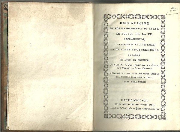DECLARACION DE LOS MANDAMIENTOS DE LA LEY, ARTICULOS DE LA FE, SACRAMENTOS, Y CEREMONIAS DE LA IGLESIA, EN TREINTA Y DOS SERMONES, SACADOS DEL LATIN EN ROMANCE POR EL R. P. FR. JUAN DE LA CRUZ, DEL ORDEN DE SANTO DOMINGO. AÑADENSE AL FIN TRES…