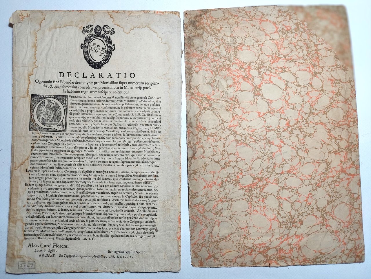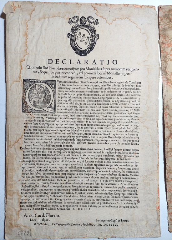 Declaratio Quomodo sint Soluendae pro Monialibus supra Numerum Recipiendis 1604 bando sui monasteri e sulle elemosine cm. 36,5 x 24