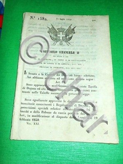 *** Atti del Governo di S. M. il Re di Sardegna: "Decreto riguardante le tariffe doganali e i Regolamenti di Dogana relative all' introduzione dei Tabacchi e della Polvere da caccia per uso dei particolari, ecc. ..."Torino, 14 luglio 1853. Pagine 38.Per appassionati studiosi e collezionisti