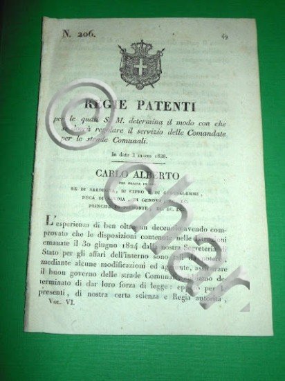 *** Atti del Governo di S. M. il Re di Sardegna: "Regie Patenti per le quali S. M. determina il modo con che si dovrà regolare il servizio delle Comandate per le strade Comunali ..."Torino, 3 Marzo 1838. Pagine 20.Per appassionati studiosi e collezionisti
