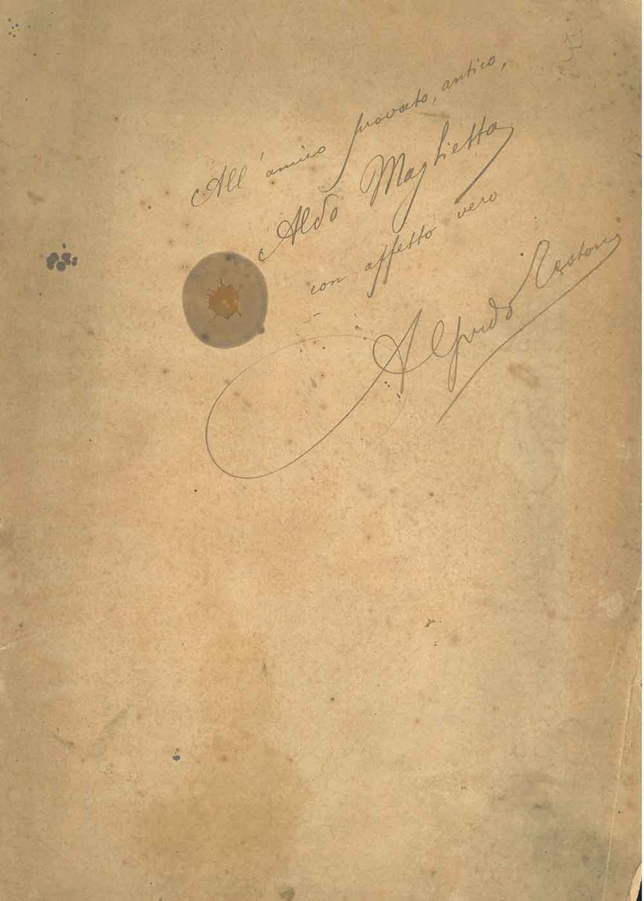 Dedica di 3 righe autografe e firmate da Testoni, su una carta sciupata